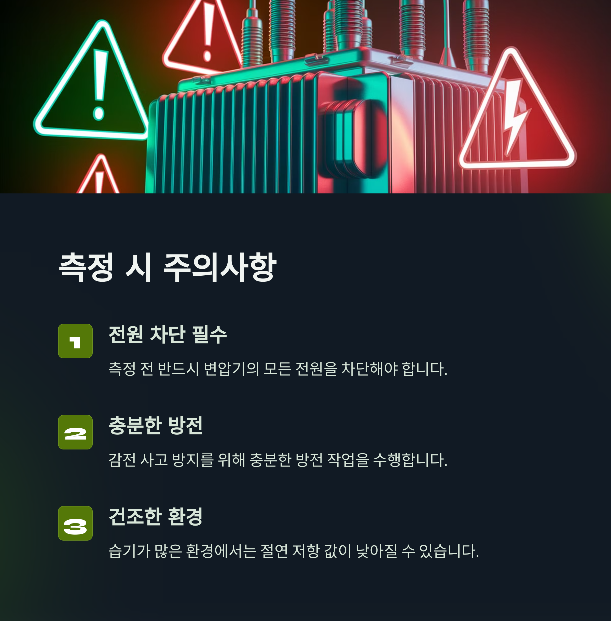 변압기의 절연 저항 측정은 전기 설비의 안전성과 신뢰성을 확보하기 위한 중요한 절차입니다. 절연 저항이 낮으면 누전, 감전, 화재 등의 위험이 증가하므로 정기적인 점검이 필요합니다.