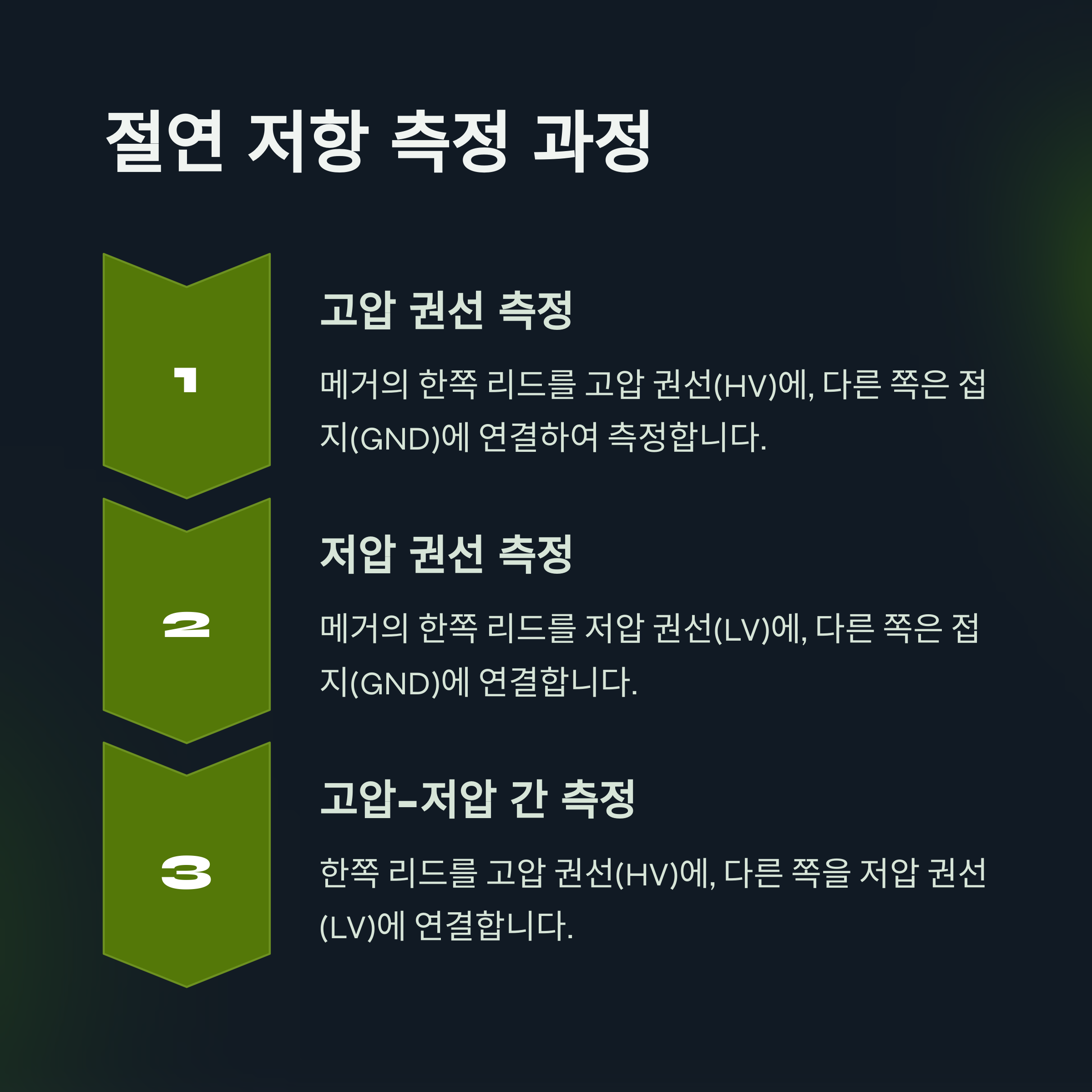 ⚡ 주의: 절연 저항이 기준치보다 낮으면 절연 열화가 진행 중일 가능성이 높으며, 즉시 정밀 점검 및 유지보수가 필요합니다.