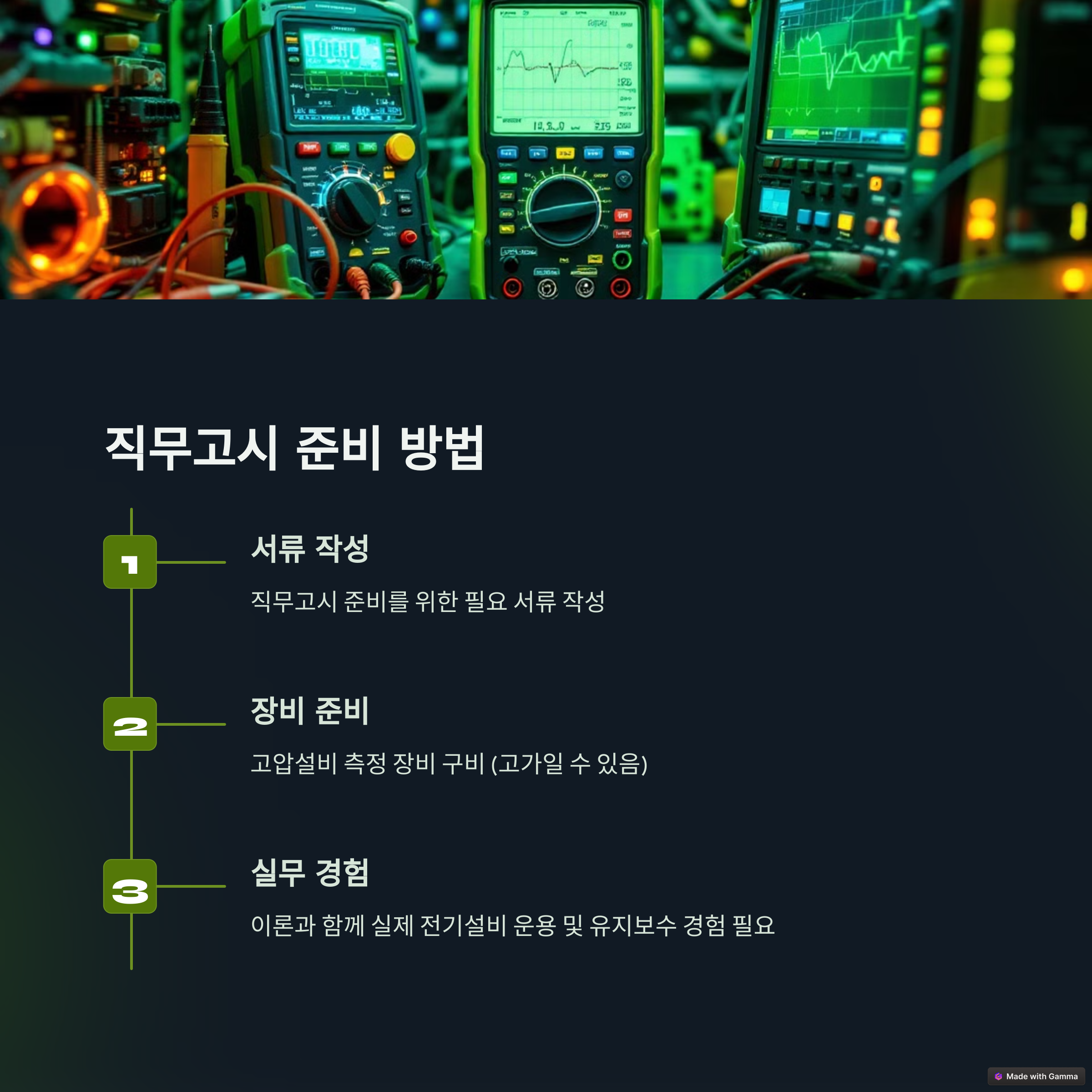 ✔ 실무 경험: 이론뿐만 아니라 실제 전기설비의 운용 및 유지보수에 대한 실습 경험이 중요합니다.