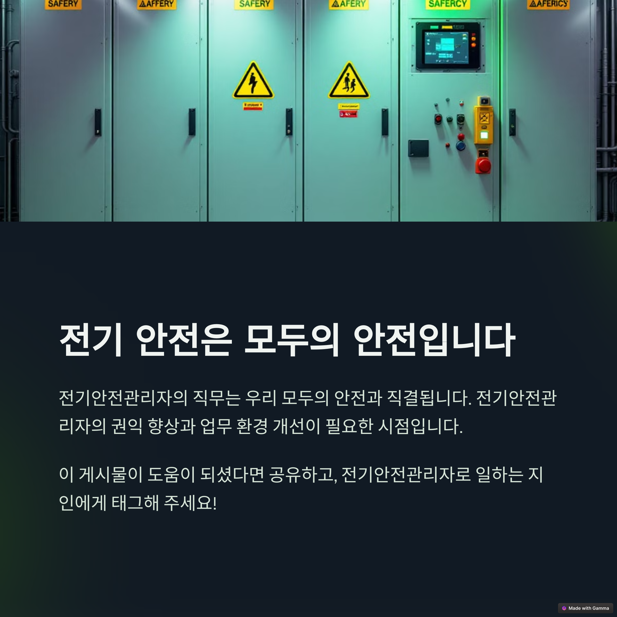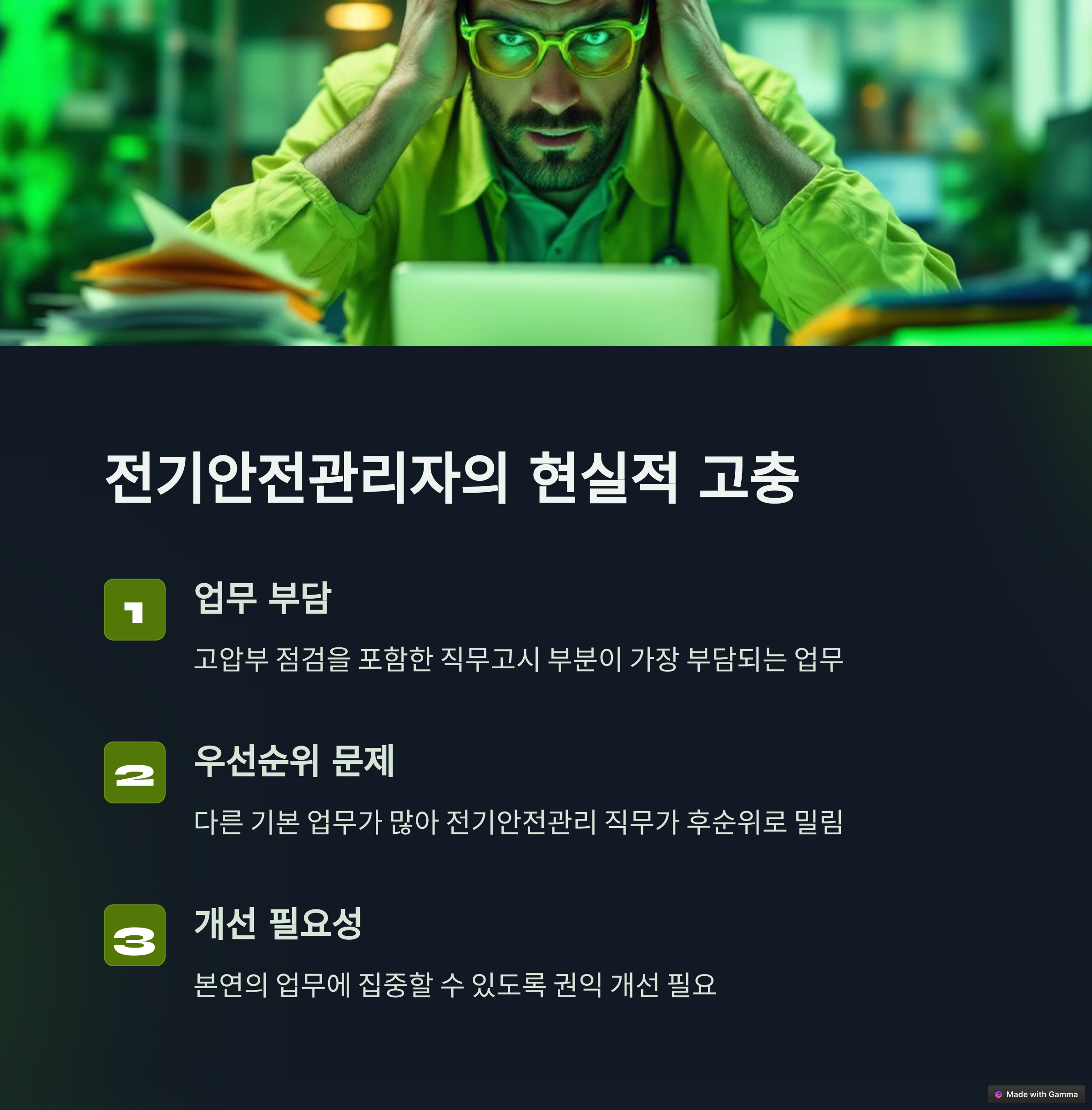 제조업이나 시설관리업에서 근무하시는 전기안전관리자의 고충은 다른 기본적인 업무들이 많고 전기안전관리자의 직무에 관한 부분은 오히려 후순위가 된다는 것입니다. 전기안전관리자의 권익을 위하여 조금씩 본연의 업무에 집중할수있도록 개선되기를 바랍니다.