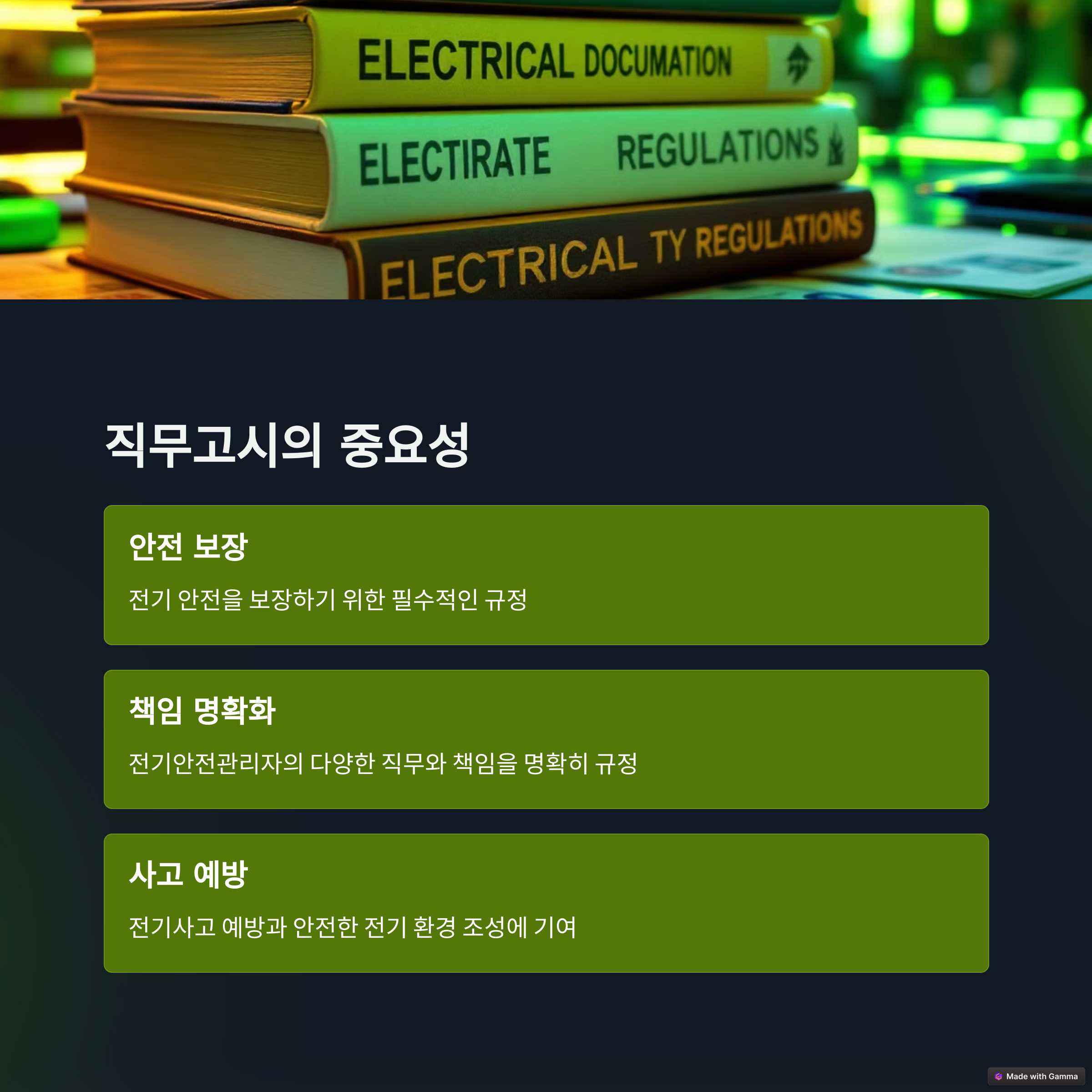 ✔ 정의: 전기안전관리자는 전기설비의 안전성을 확보하고, 전기사고를 예방하기 위해 필요한 모든 조치를 취하는 역할을 맡고 있습니다.