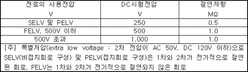 | 측정 대상 | 측정 전압 | 절연저항 기준 (최소값) |