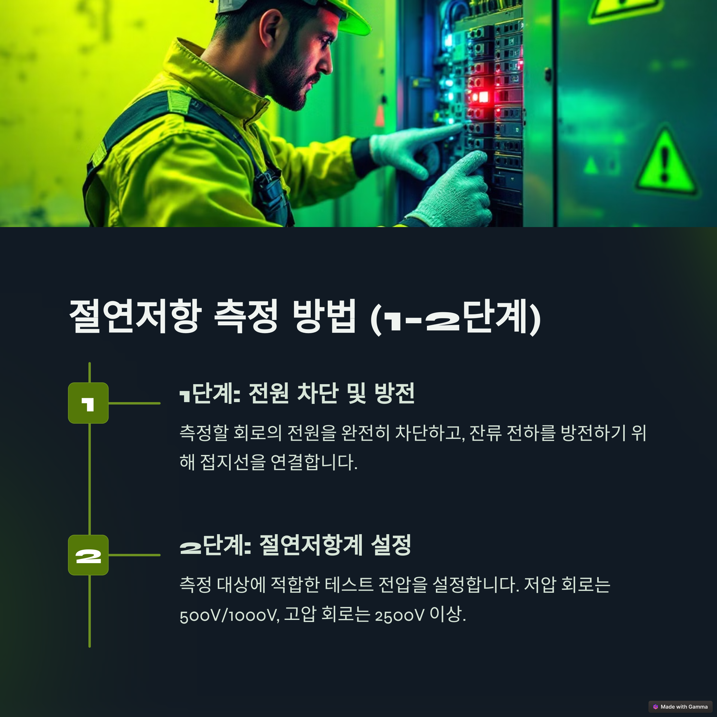 절연저항 측정은 일반적으로 전원 차단 후 특정 전압을 인가하여 절연 상태를 확인하는 방식으로 진행됩니다.