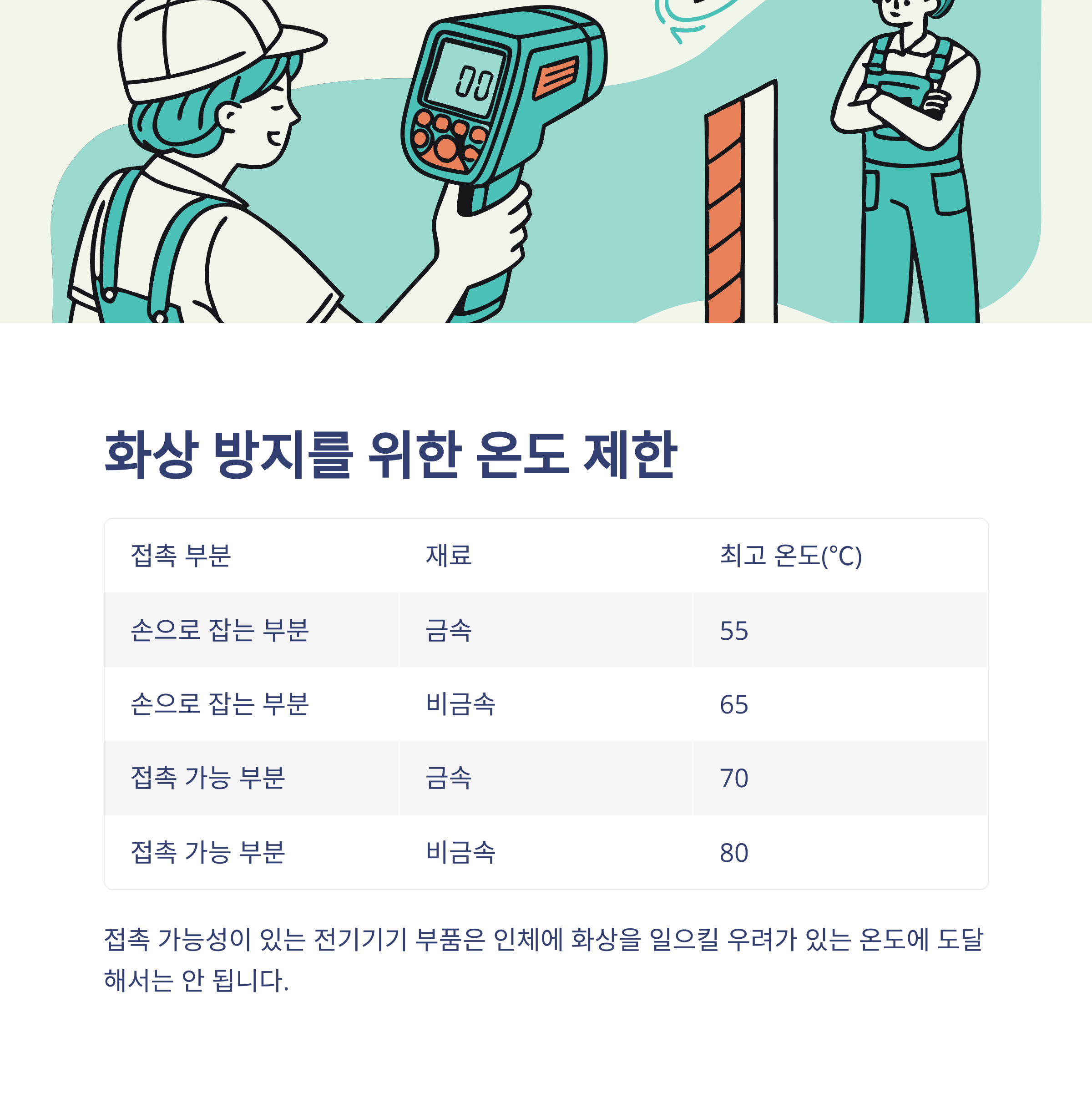 접촉범위 내에 있고, 접촉 가능성이 있는 전기기기의 부품류는 인체에 화상을 일으킬 우려가 있는 온도에 도달해서는 안 되며, 표 214.2-1에 제시된 제한 값을 준수하여야 한다. 이 경우 우발적 접촉도 발생하지 않도록 보호를 하여야 한다.