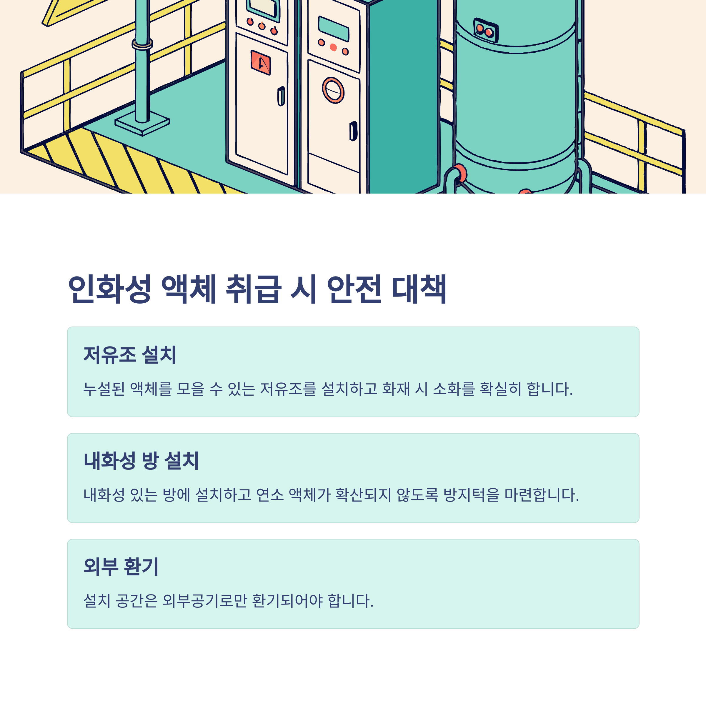가. 누설된 액체를 모을 수 있는 저유조를 설치하고 화재 시 소화를 확실히 한다.