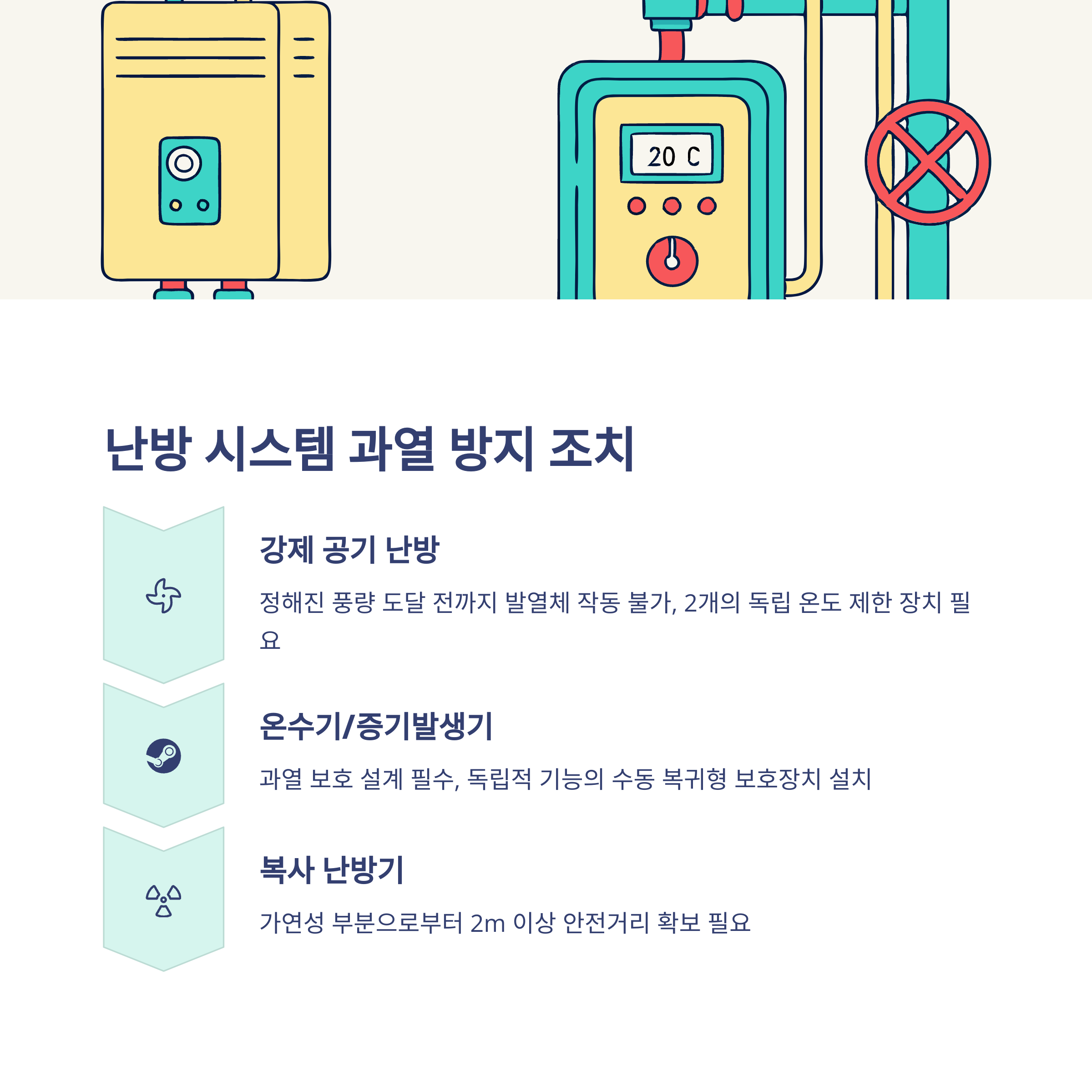 1. 온수 또는 증기를 발생시키는 장치는 어떠한 운전 상태에서도 과열 보호가 되도록 설계 또는 공사를 하여야 한다. 보호장치는 기능적으로 독립된 자동 온도조절장치로부터 독립적 기능을 하는 수동 복귀형 장치이어야 한다. 다만, 관련된 표준 모두에 적합한 장치는 제외한다.