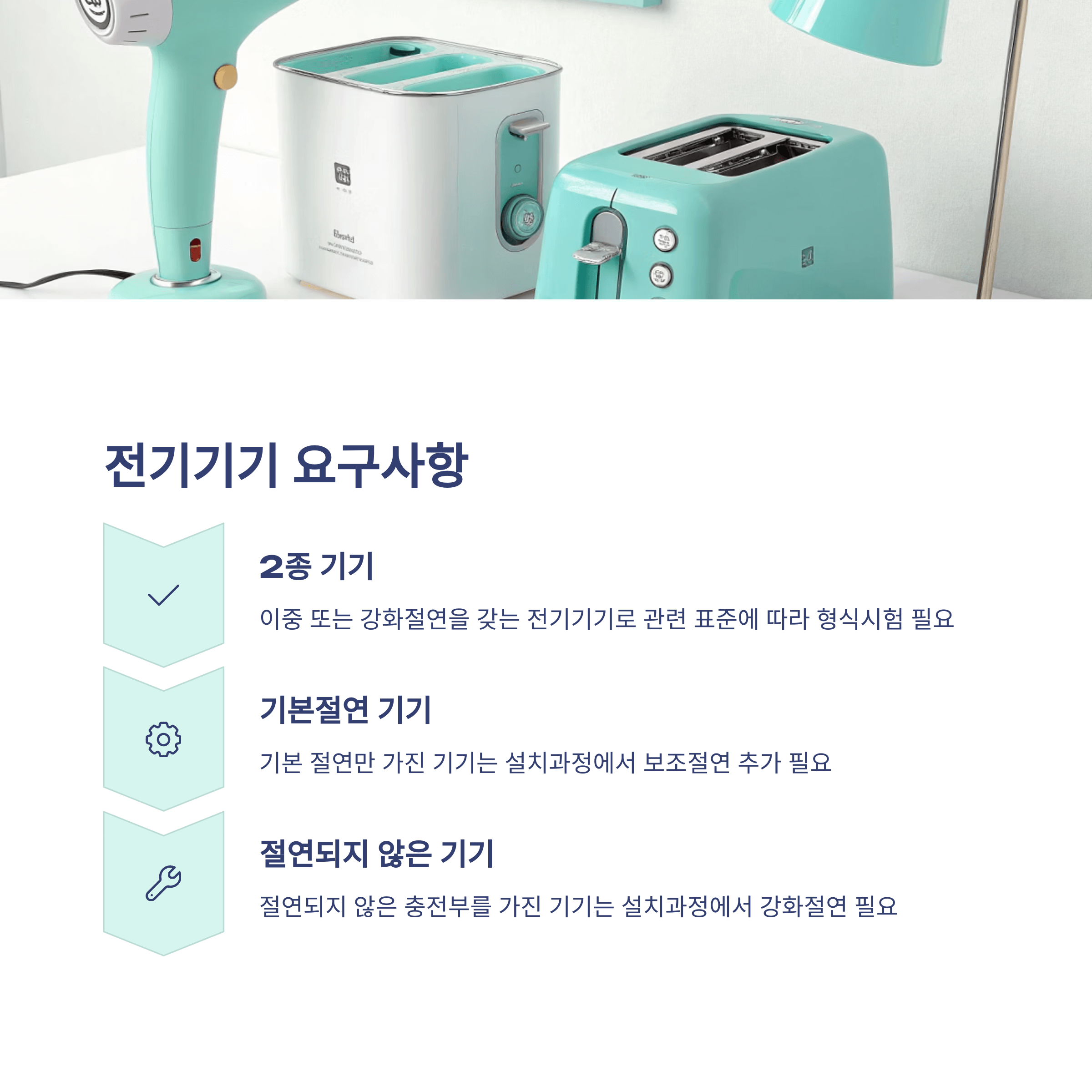 나. 전기기기는 관련 표준에 따라 형식시험을 하고 관련표준이 표시된 다음과 같은 종류의 것이어야 한다.