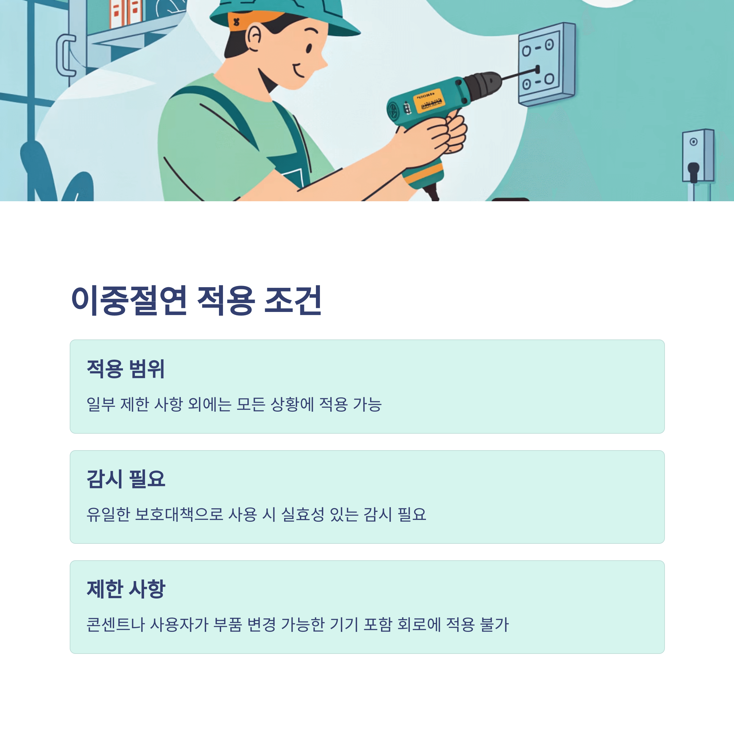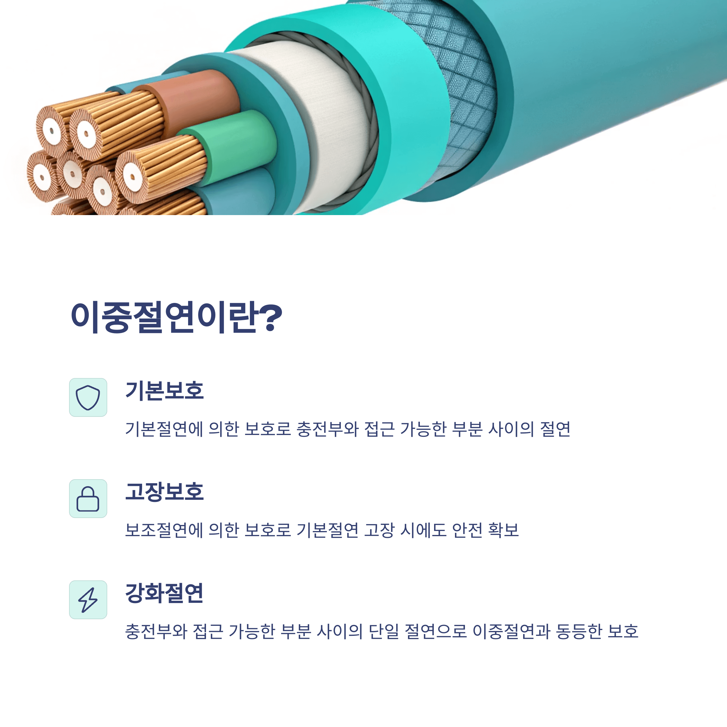 1. 이중 또는 강화절연은 기본절연의 고장으로 인해 전기기기의 접근 가능한 부분에 위험전압이 발생하는 것을 방지하기 위한 보호대책으로 다음에 따른다.