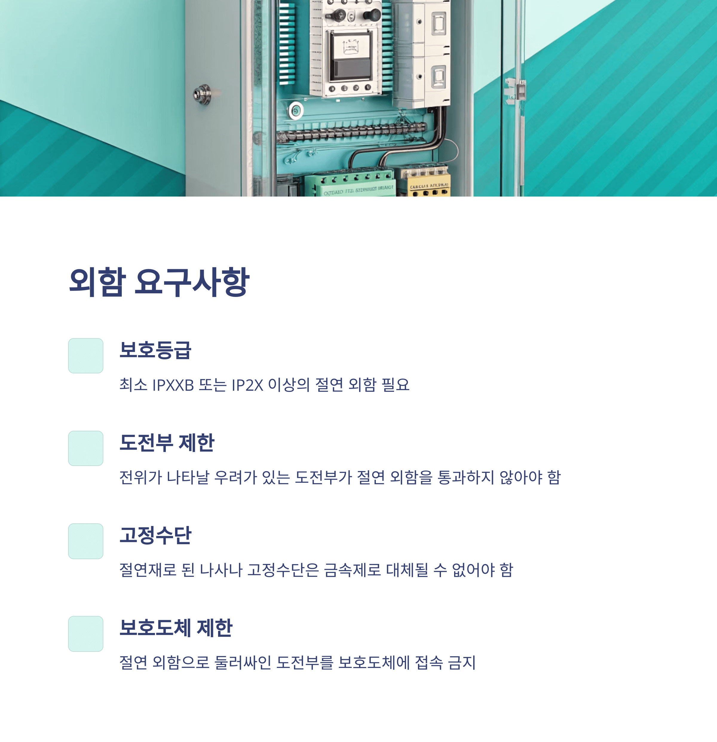 다. 절연 외함의 덮개나 문을 공구 또는 열쇠를 사용하지 않고도 열 수 있다면, 덮개나 문이 열렸을 때 접근 가능한 전체 도전부는 사람이 무심코 접촉되는 것을 방지하기 위해 절연 격벽(IPXXB 또는 IP2X이상 제공)의 뒷부분에 배치하여야 한다. 이러한 절연 격벽은 공구 또는 열쇠를 사용해서만 제거할 수 있어야 한다.