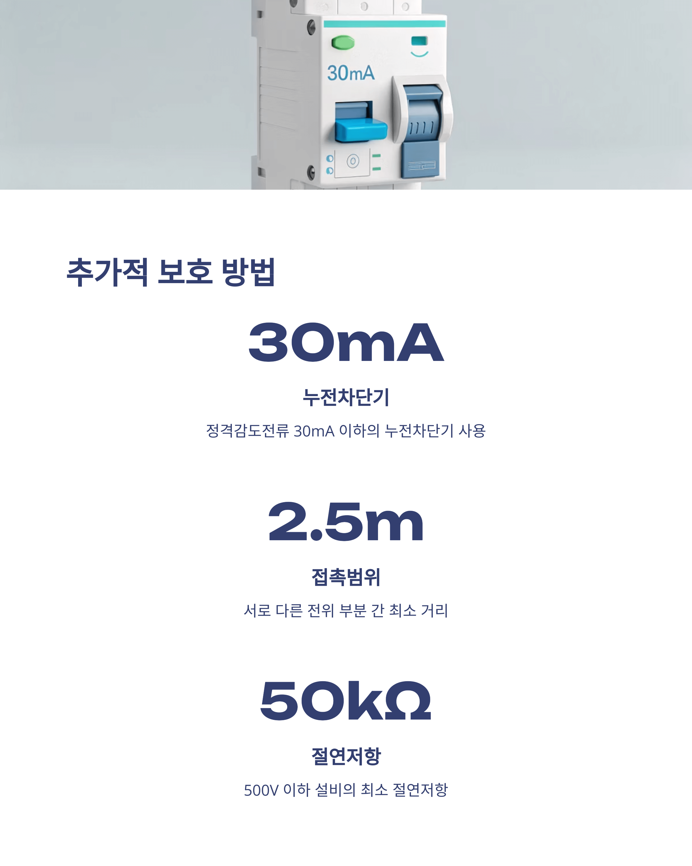 1. 기본보호 및 고장보호를 위한 대상 설비의 고장 또는 사용자의 부주의로 인하여 설비에 고장이 발생한 경우에는 정격감도전류 30 mA 이하의 누전차단기를 사용하는 경우에는 추가적인 보호로 본다.