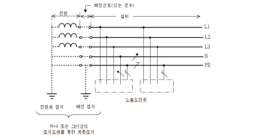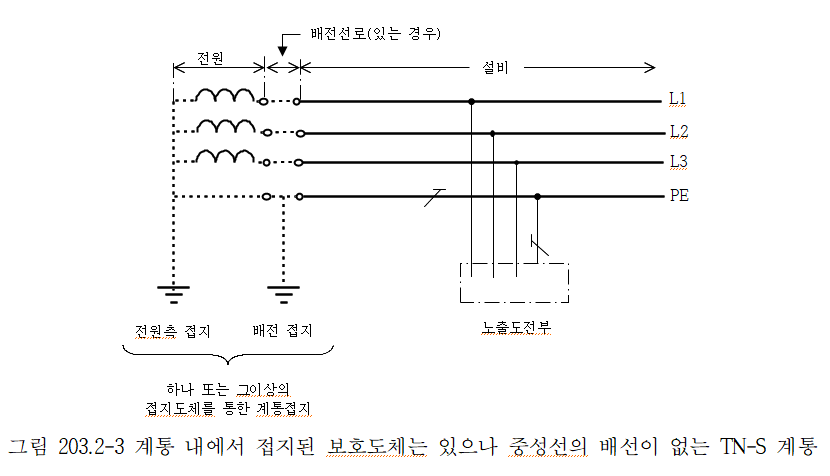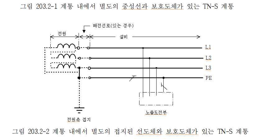 1. TN-S 계통은 계통 전체에 대해 별도의 중성선 또는 PE 도체를 사용한다. 배전계통에서 PE 도체를 추가로 접지할 수 있다.