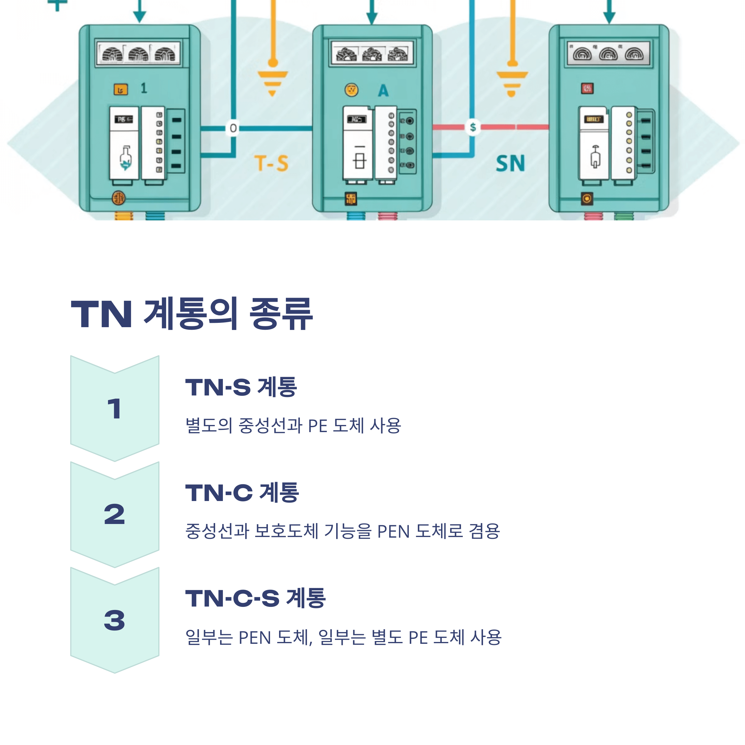 3. TN-C-S계통은 계통의 일부분에서 PEN 도체를 사용하거나, 중성선과 별도의 PE 도체를 사용하는 방식이 있다. 배전계통에서 PEN 도체와 PE 도체를 추가로 접지할 수 있다.