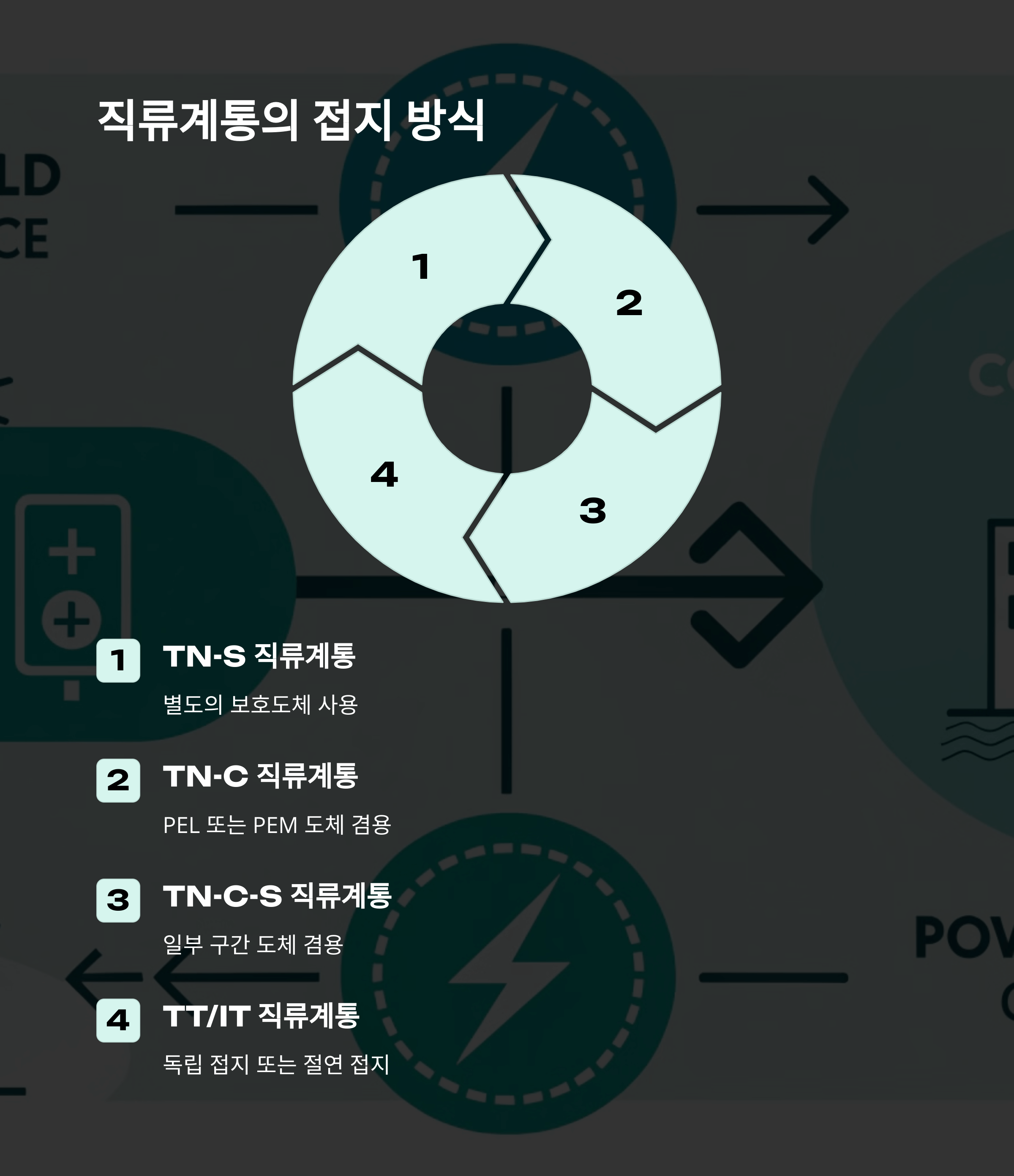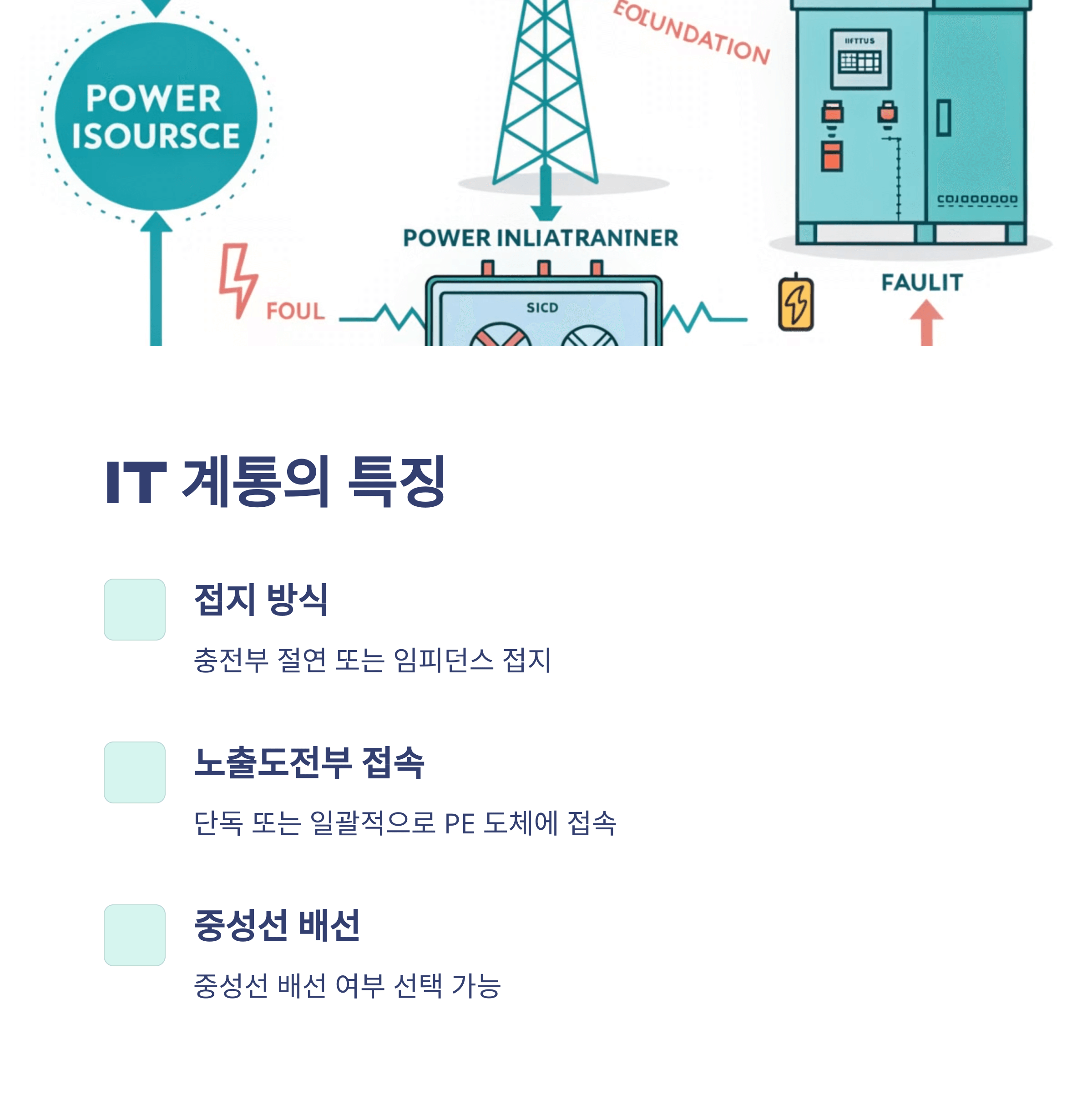 1. 충전부 전체를 대지로부터 절연시키거나, 한 점을 임피던스를 통해 대지에 접속시킨다. 전기설비의 노출도전부를 단독 또는 일괄적으로 계통의 PE 도체에 접속시킨다. 배전계통에서 추가접지가 가능하다.