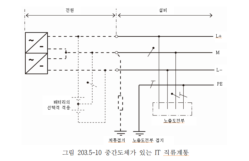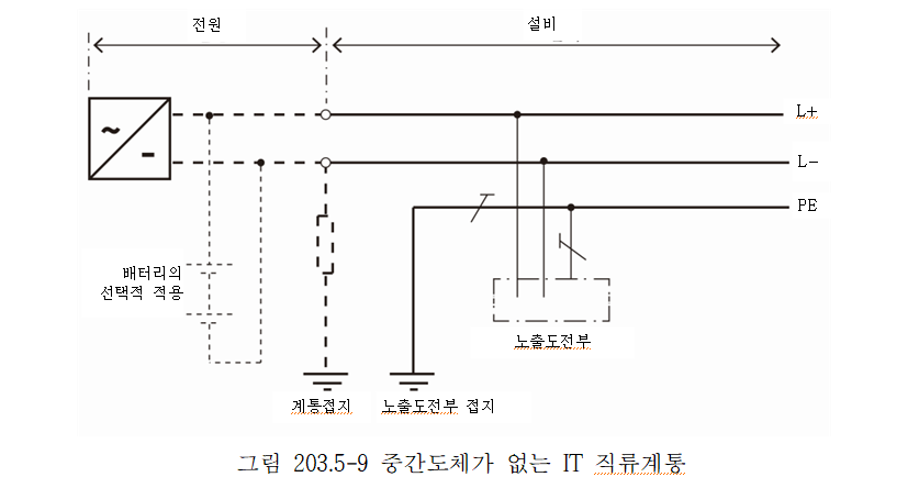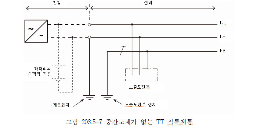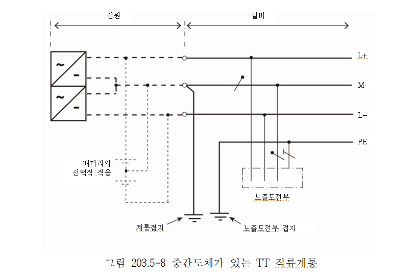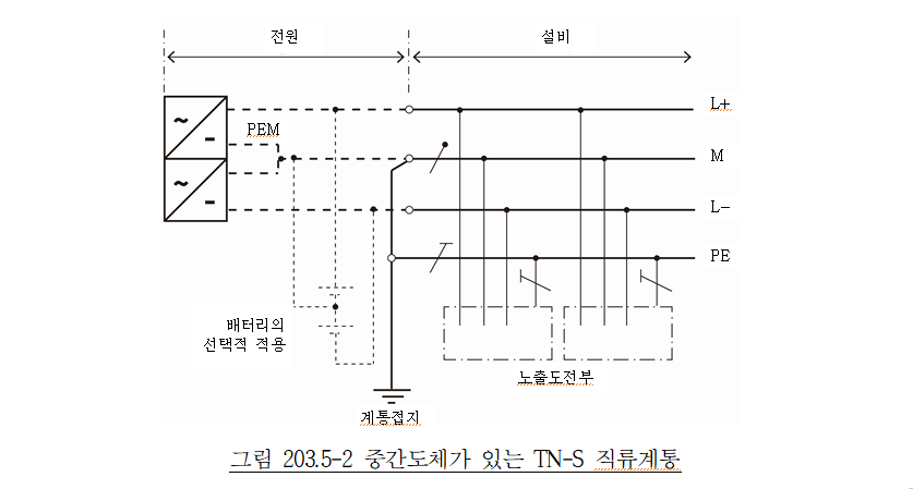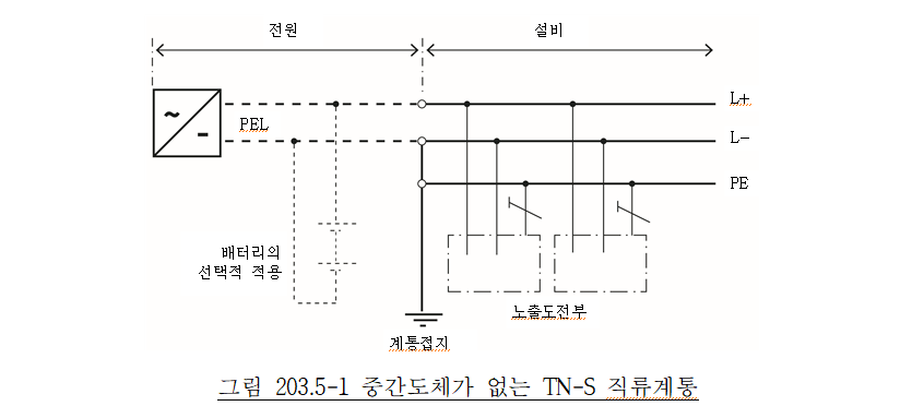 직류계통의 계통접지 방식으로 그림 203.5-1∼203.5-10까지는 직류계통의 특정 극을 접지하고 있지만 양극 또는 음극의 어느 쪽을 접지하는가는 운전환경, 부식방지 등을 고려하여 결정하여야 한다.