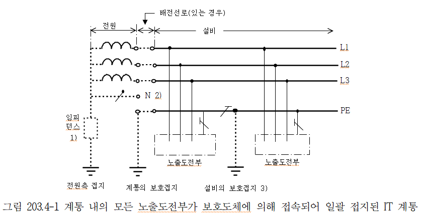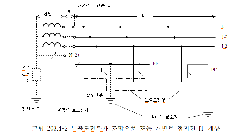 2. 계통은 높은 임피던스를 통하여 접지할 수 있다. 이 접속은 중성점, 인위적 중성점, 선도체 등에서 할 수 있다. 중성선은 배선할 수도 있고, 배선하지 않을 수도 있다.