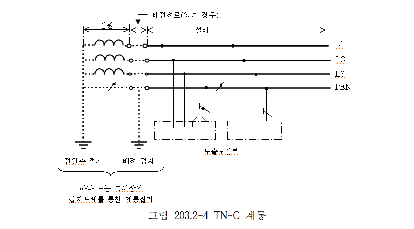 2. TN-C 계통은 그 계통 전체에 대해 중성선과 보호도체의 기능을 동일도체로 겸용한 PEN 도체를 사용한다. 배전계통에서 PEN 도체를 추가로 접지할 수 있다.