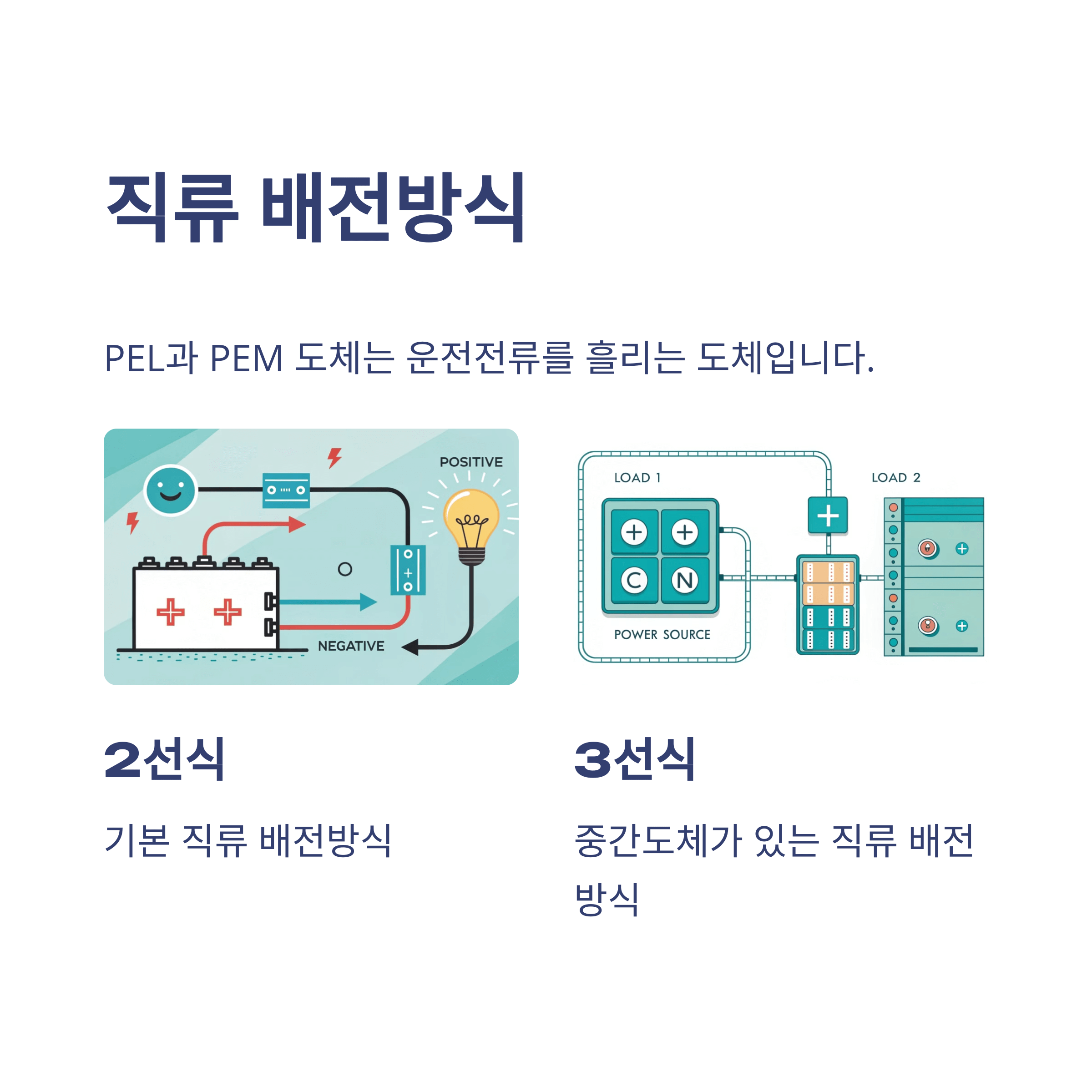 PEL과 PEM 도체는 충전도체는 아니지만 운전전류를 흘리는 도체이다. 2선식 배전방식이나 3선식 배전방식을 적용한다.