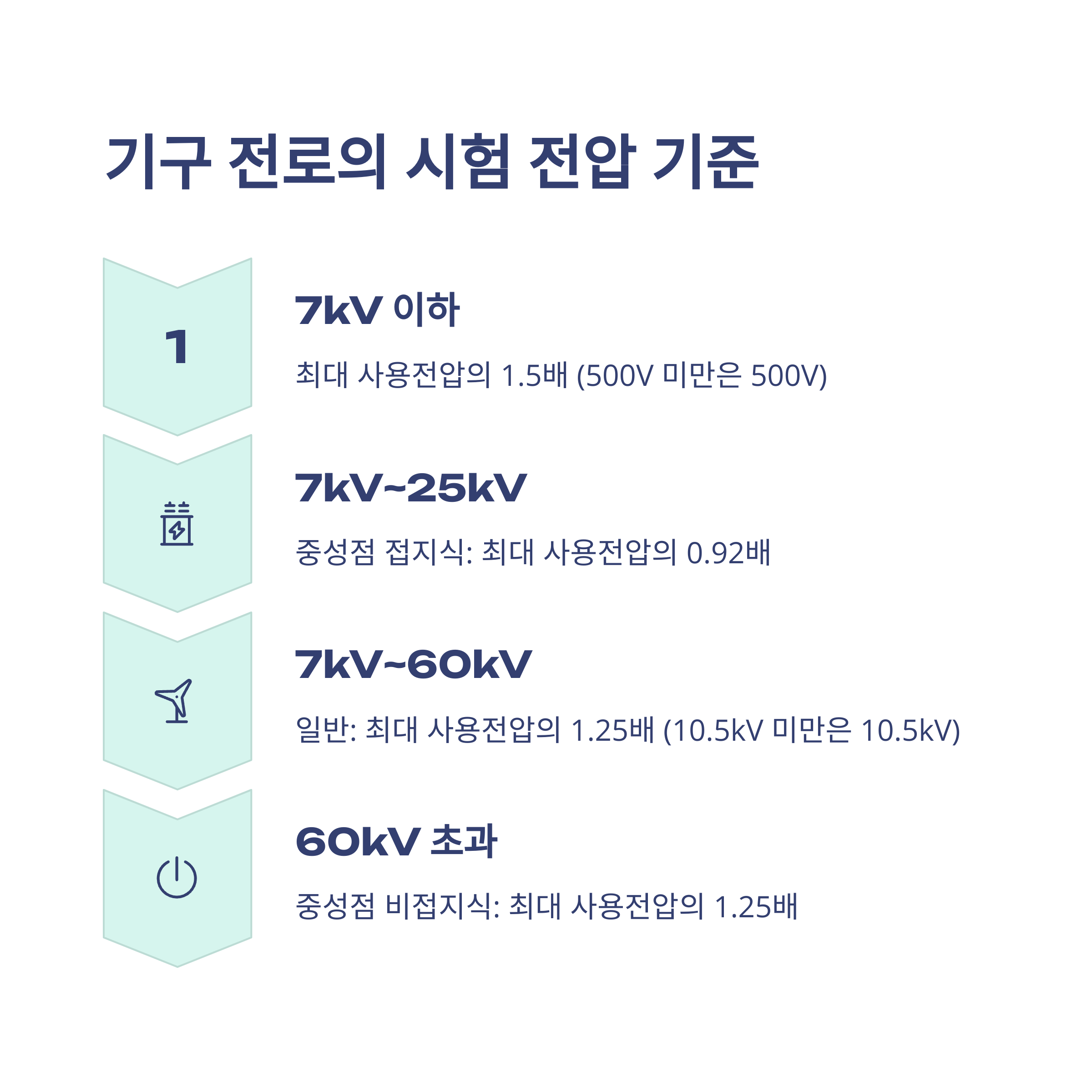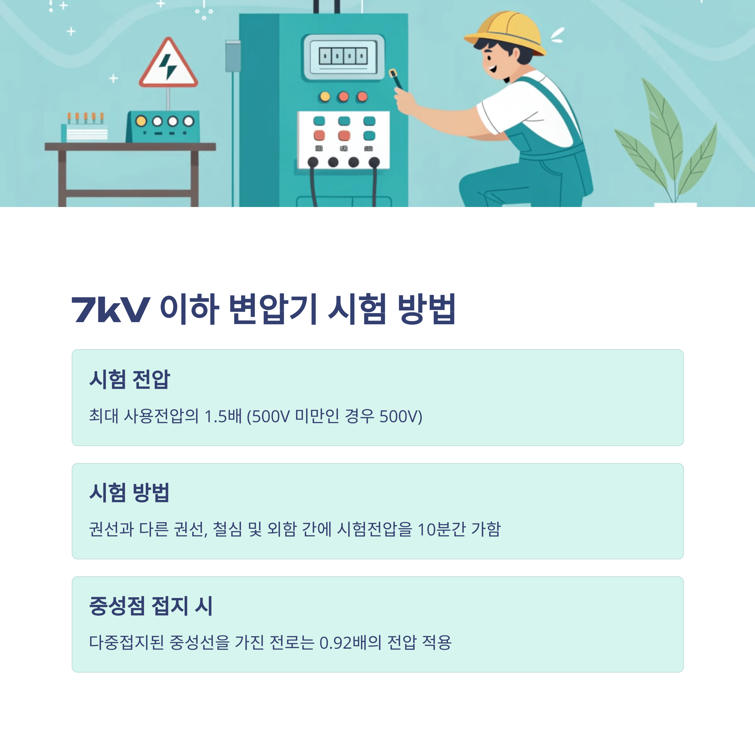 | 1. 최대 사용전압 7 kV 이하 | 최대 사용전압의 1.5배의 전압(500 V 미만으로 되는 경우에는 500 V) 다만, 중성점이 접지되고 다중접지된 중성선을 가지는 전로에 접속하는 것은 0.92배의 전압(500 V 미만으로 되는 경우에는 500 V) | 시험되는 권선과 다른 권선, 철심 및 외함 간에 시험전압을 연속하여 10분간 가한다. |