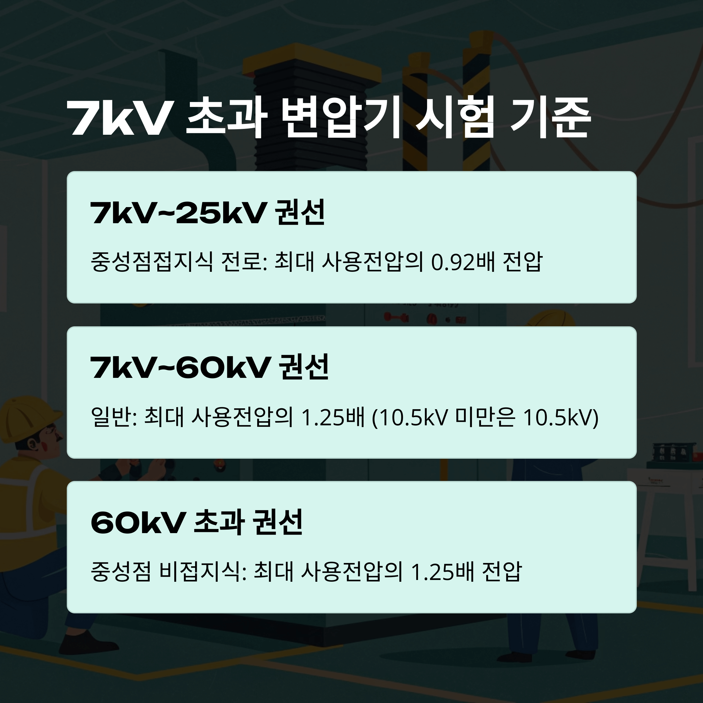 | 3. 최대 사용전압 7 kV 초과 60 kV 이하의 권선(2란의 것을 제외한다) | 최대 사용전압의 1.25배의 전압(10.5 kV 미만으로 되는 경우에는 10.5 kV) | |