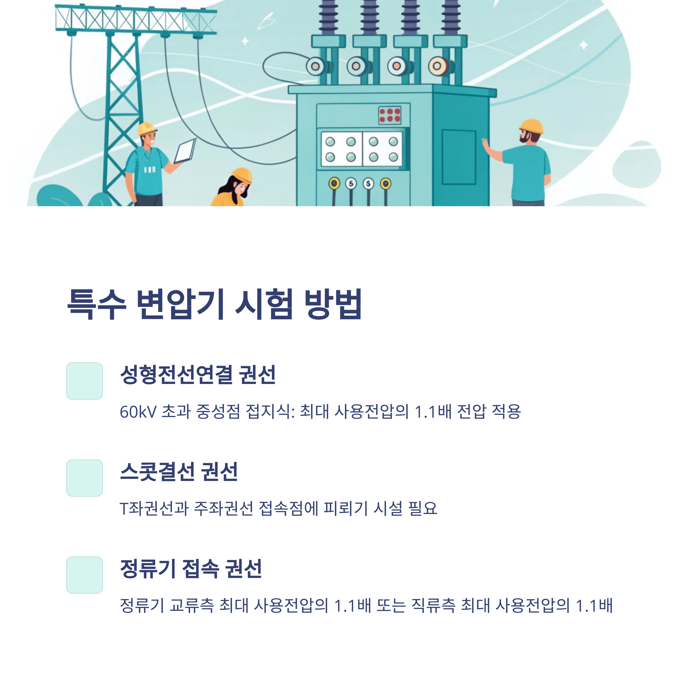 | 8. 최대 사용전압이 60 kV를 초과하는 정류기에 접속하는 권선 | 정류기의 교류측의 최대 사용전압의 1.1배의 교류전압 또는 정류기의 직류측의 최대 사용전압의 1.1배의 직류전압 | 시험되는 권선과 다른 권선, 철심 및 외함 간에 시험전압을 연속하여 10분간 가한다. |