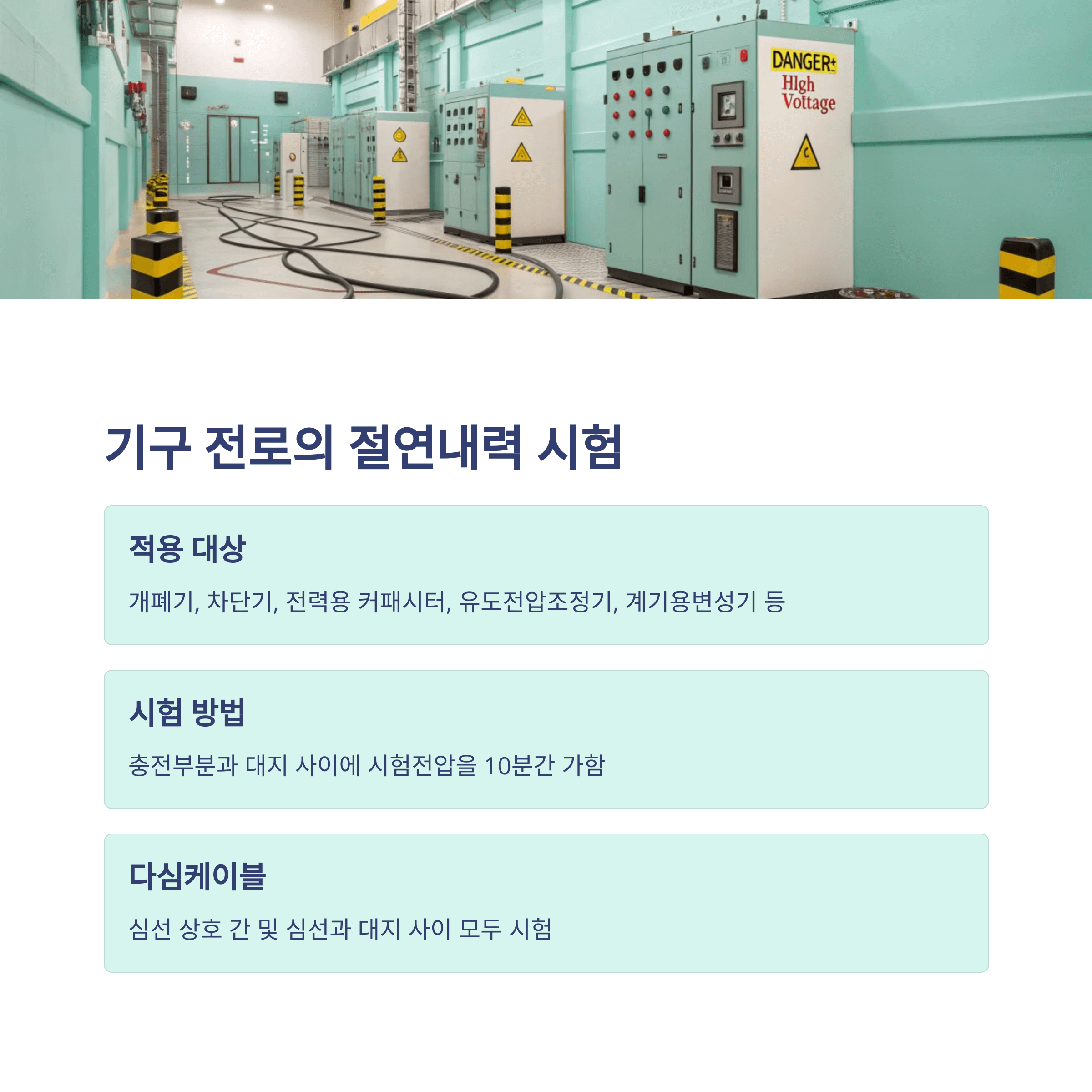 | 1. 최대 사용전압이 7 kV 이하인 기구 등의 전로 | 최대 사용전압이 1.5배의 전압(직류의 충전 부분에 대하여는 최대 사용전압의 1.5배의 직류전압 또는 1배의 교류전압) (500 V 미만으로 되는 경우에는 500 V) |