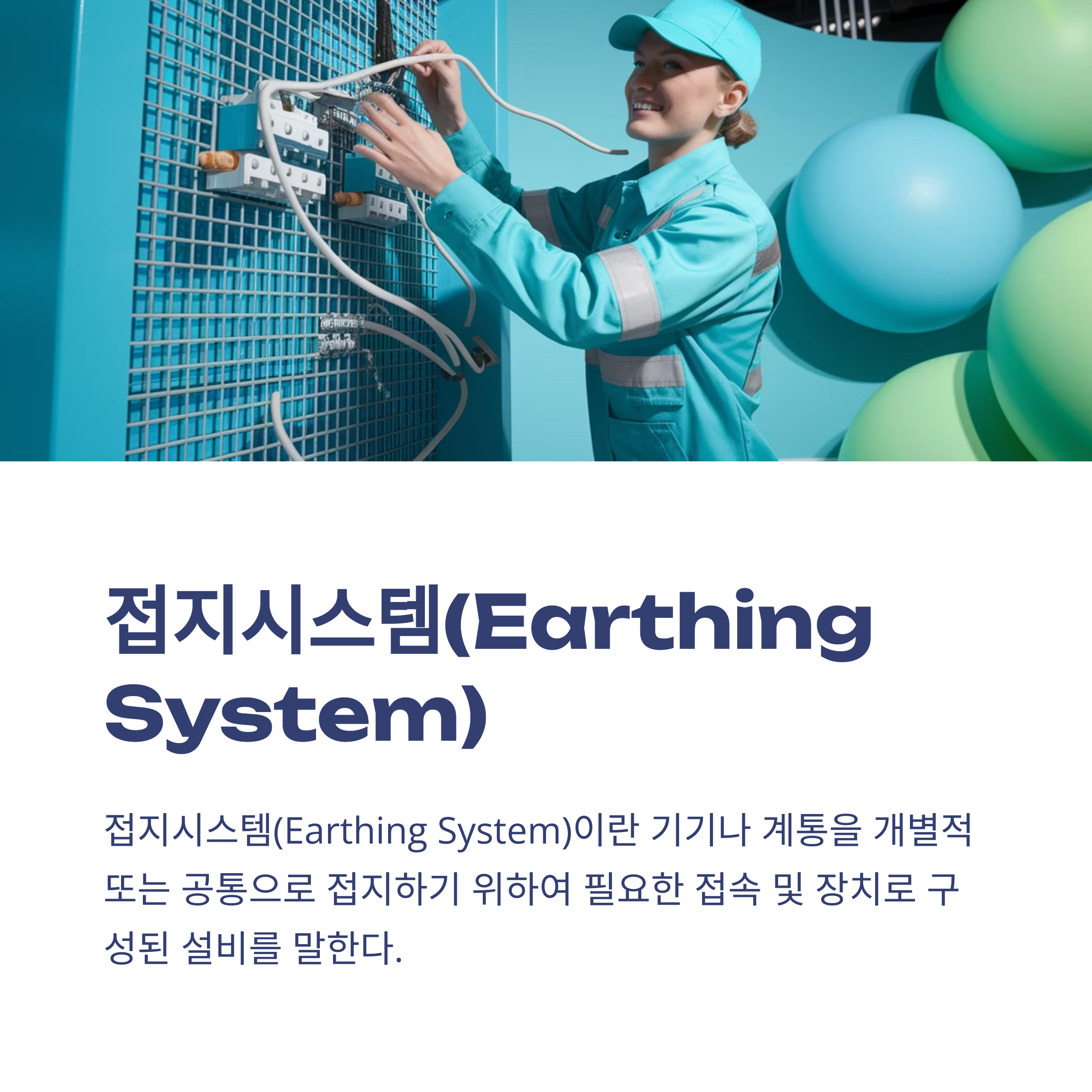 “접지시스템(Earthing System)” 이란 기기나 계통을 개별적 또는 공통으로 접지하기 위하여 필요한 접속 및 장치로 구성된 설비를 말한다