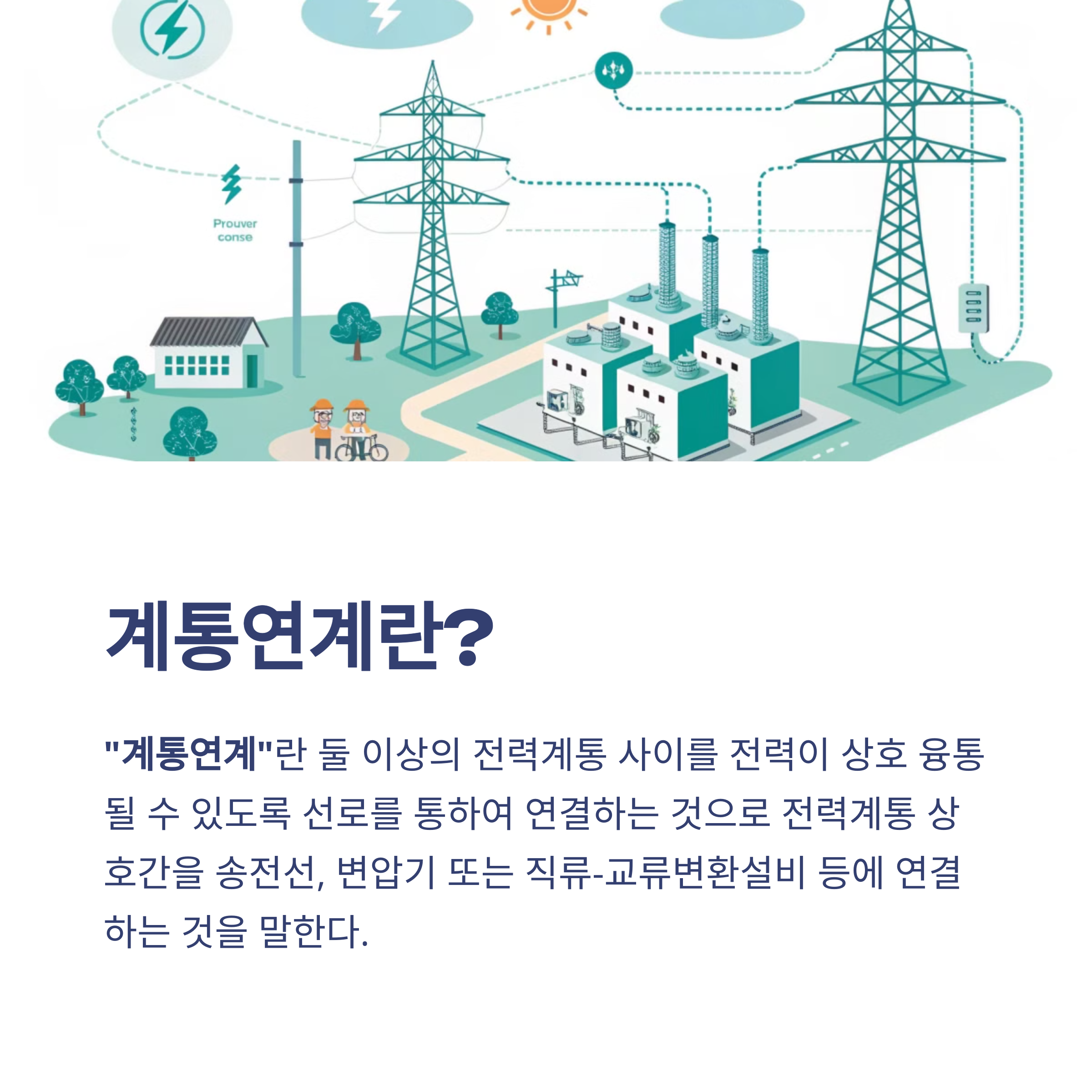 “계통연계” 란 둘 이상의 전력계통 사이를 전력이 상호 융통될 수 있도록 선로를 통하여 연결하는 것으로 전력계통 상호간을 송전선, 변압기 또는 직류-교류변환설비 등에 연결하는 것을 말한다