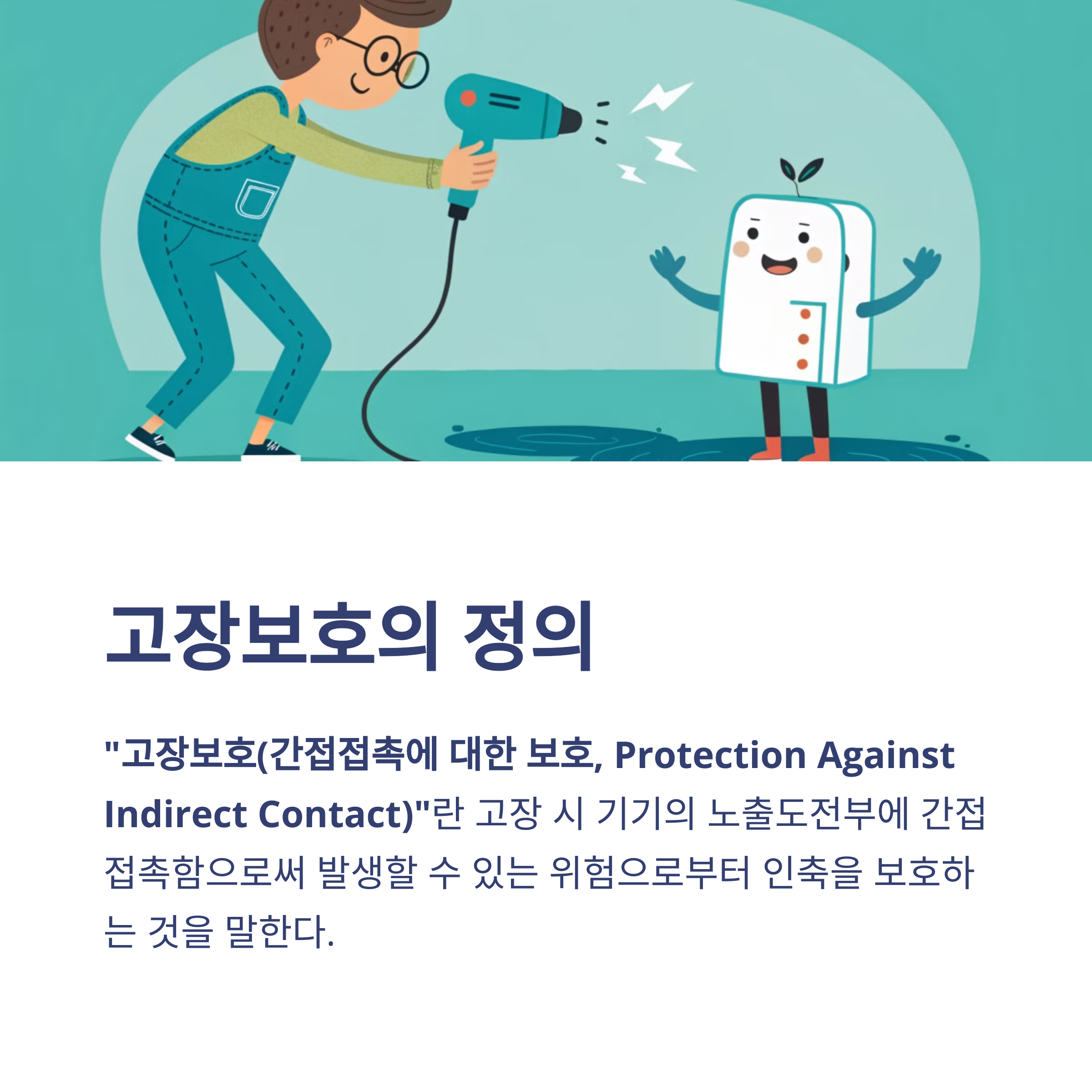 “고장보호(간접접촉에 대한 보호, Protection Against Indirect Contact)” 란 고장 시 기기의 노출도전부에 간접 접촉함으로써 발생할 수 있는 위험으로부터 인축을 보호하는 것을 말한다