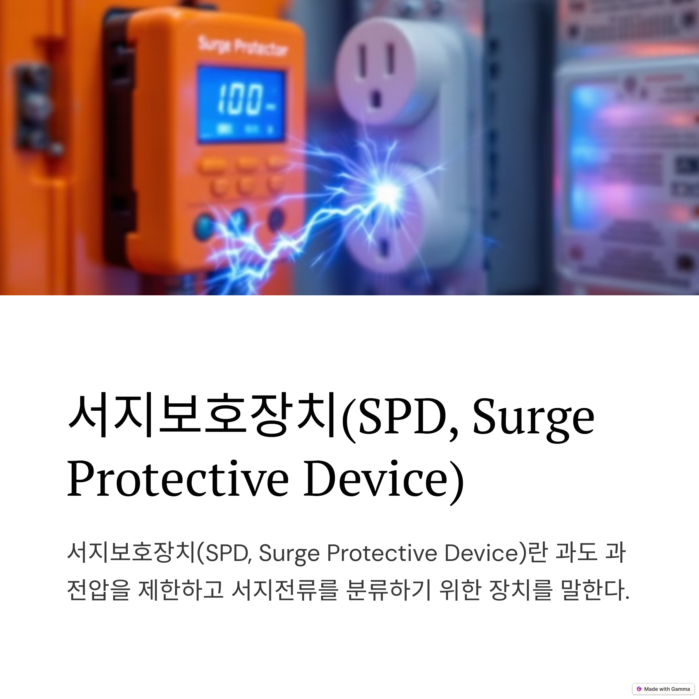 “서지보호장치(SPD, Surge Protective Device)” 란 과도 과전압을 제한하고 서지전류를 분류하기 위한 장치를 말한다