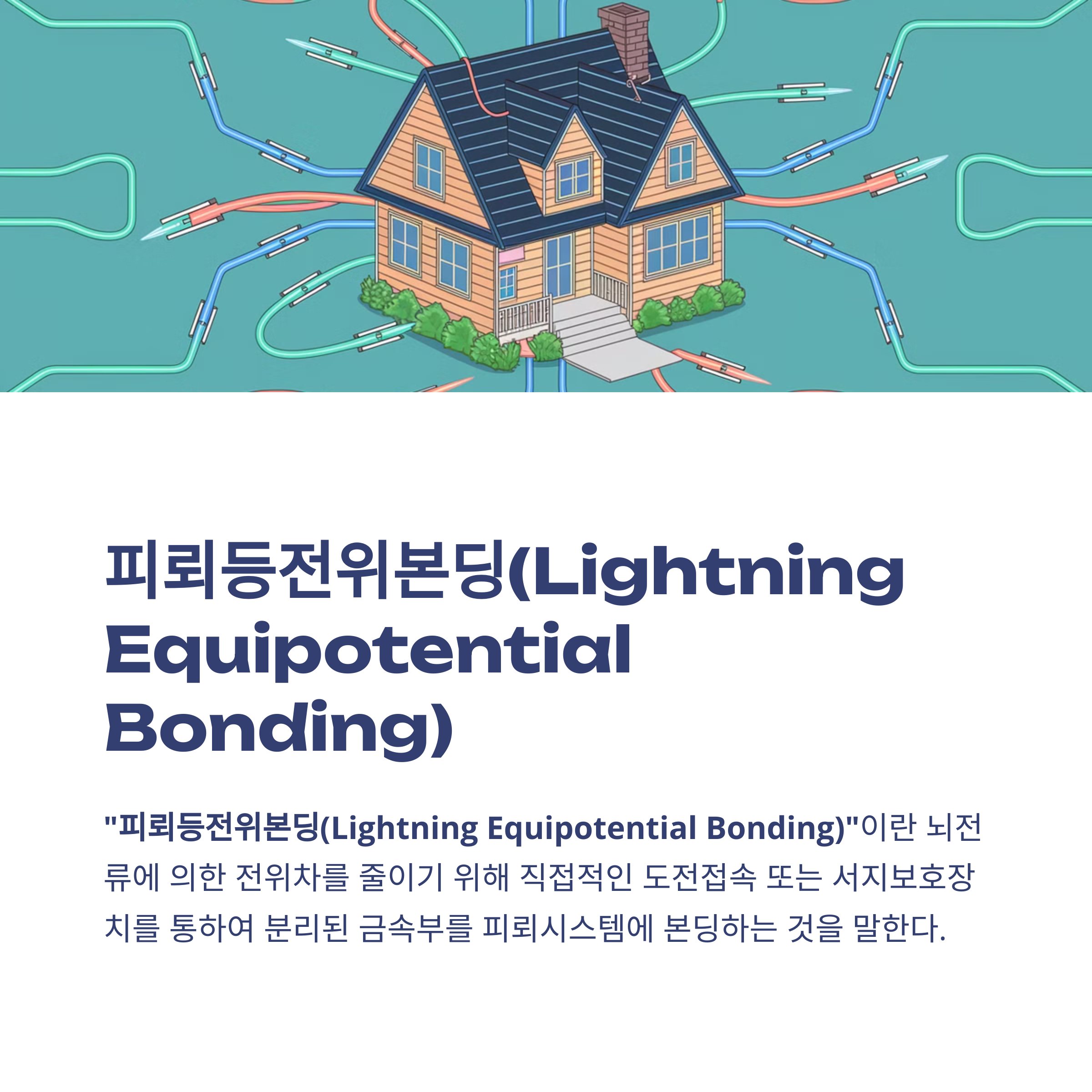 “피뢰등전위본딩(Lightning Equipotential Bonding)” 이란 뇌전류에 의한 전위차를 줄이기 위해 직접적인 도전접속 또는 서지보호장치를 통하여 분리된 금속부를 피뢰시스템에 본딩하는 것을 말한다