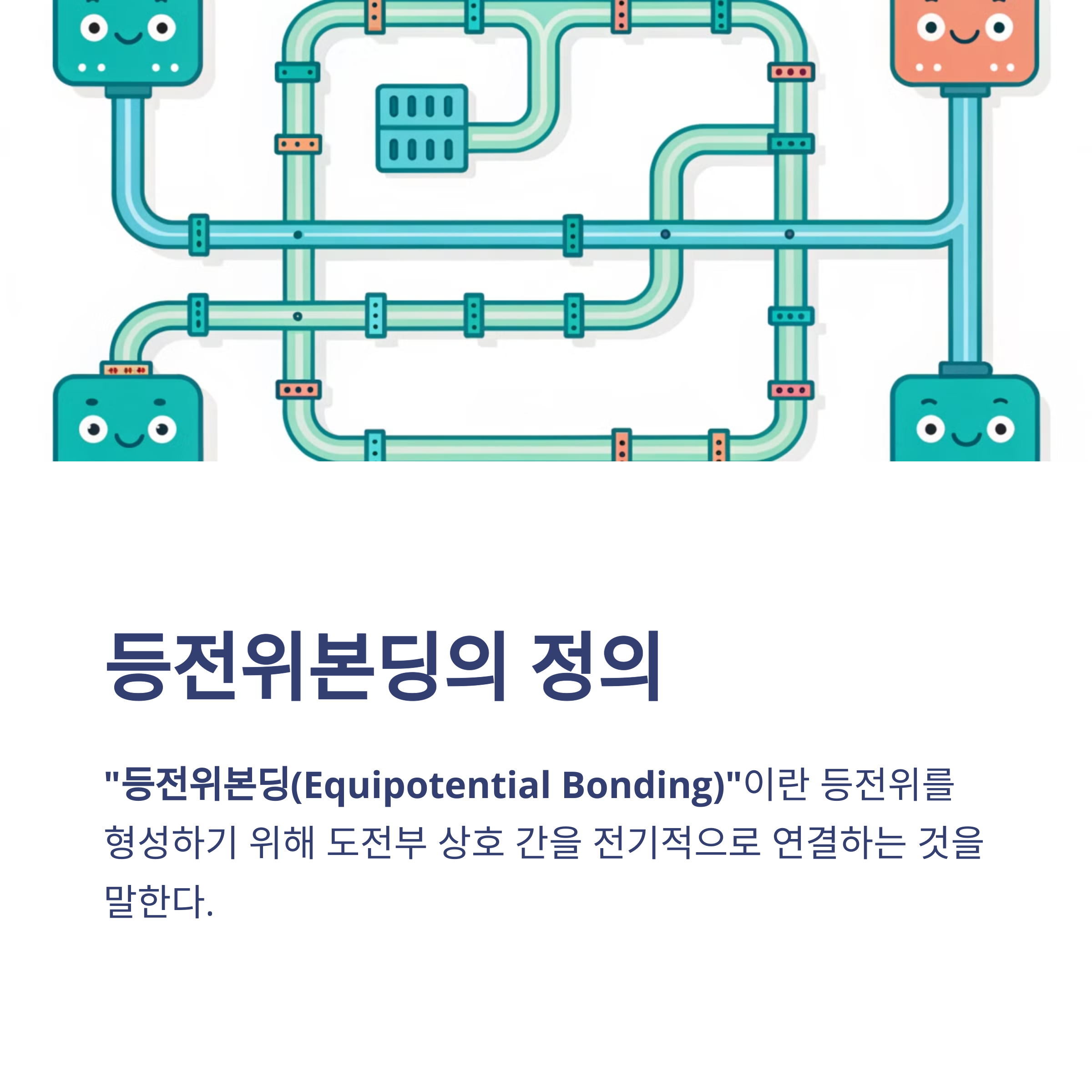 “등전위본딩(Equipotential Bonding)” 이란 등전위를 형성하기 위해 도전부 상호 간을 전기적으로 연결하는 것을 말한다