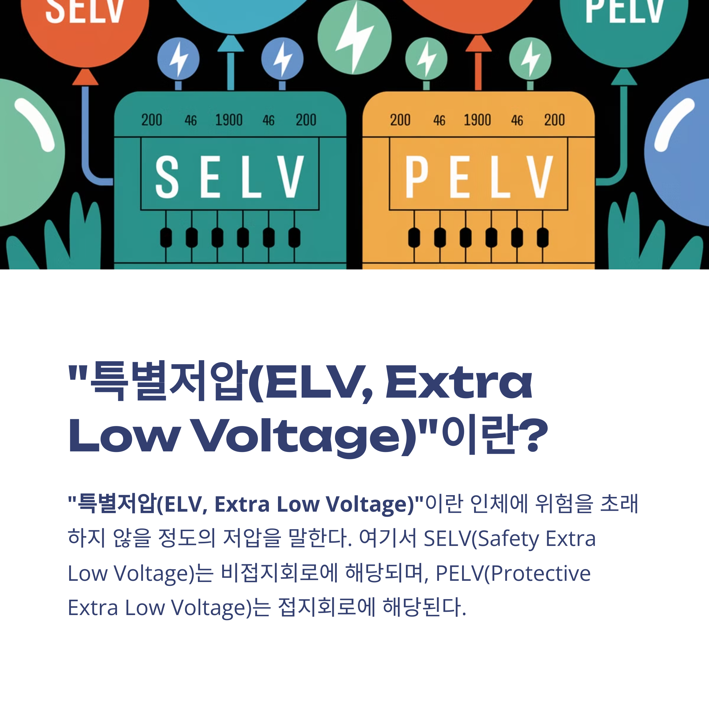 “특별저압(ELV, Extra Low Voltage)” 이란 인체에 위험을 초래하지 않을 정도의 저압을 말한다. 여기서 SELV(Safety Extra Low Voltage)는 비접지회로에 해당되며, PELV(Protective Extra Low Voltage)는 접지회로에 해당된다