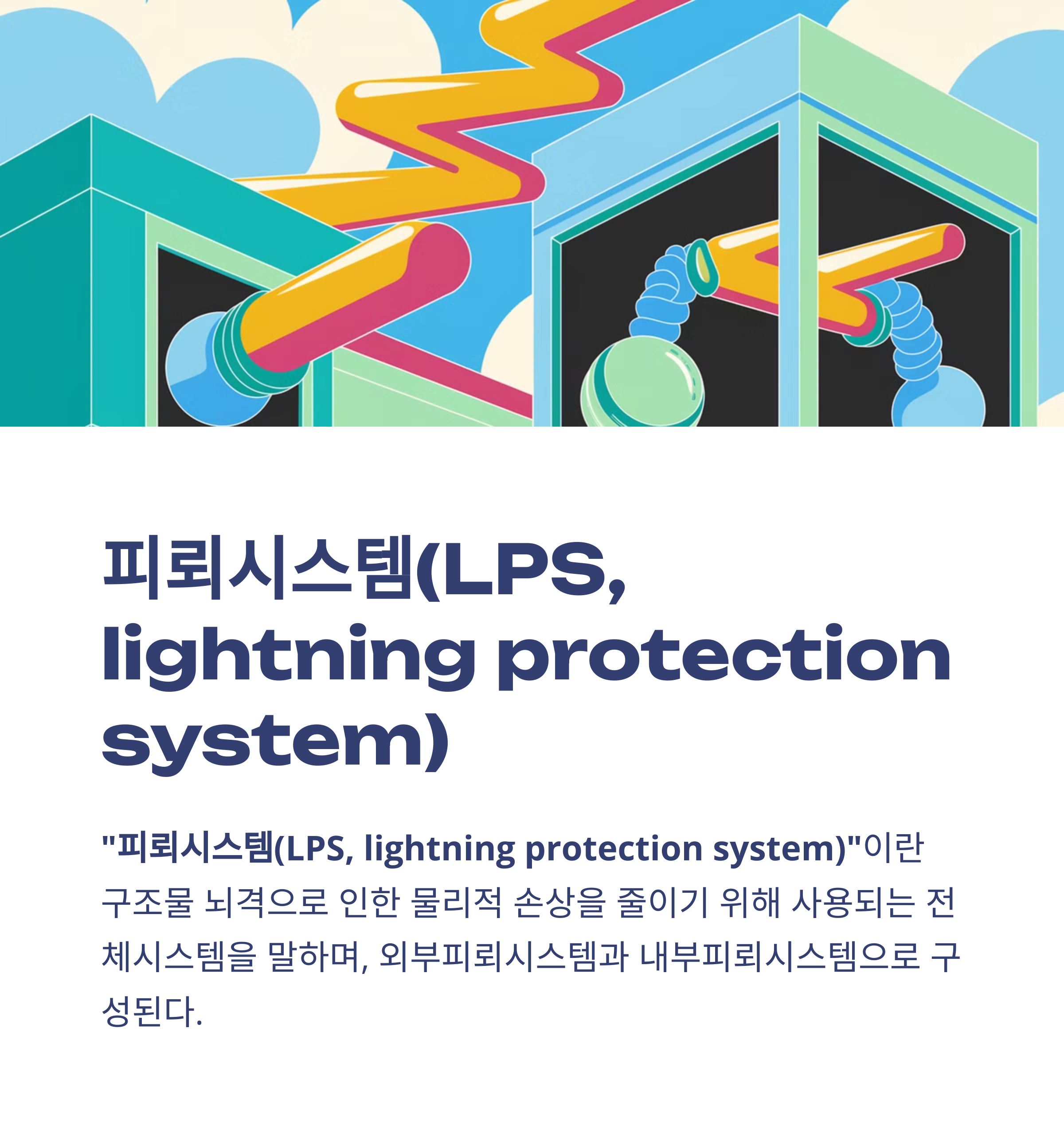 “피뢰시스템(LPS, lightning protection system)” 이란 구조물 뇌격으로 인한 물리적 손상을 줄이기 위해 사용되는 전체시스템을 말하며, 외부피뢰시스템과 내부피뢰시스템으로 구성된다