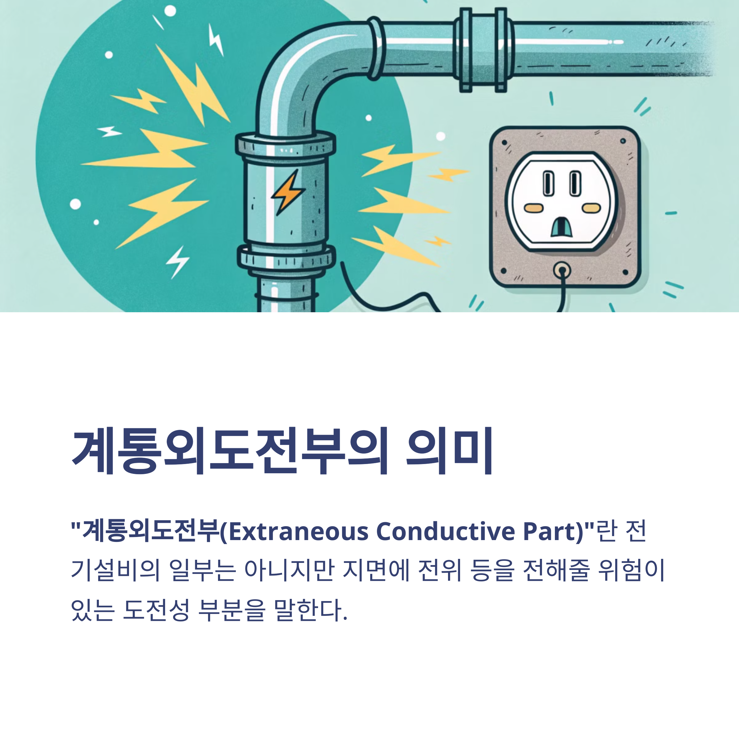 “계통외도전부(Extraneous Conductive Part)” 란 전기설비의 일부는 아니지만 지면에 전위 등을 전해줄 위험이 있는 도전성 부분을 말한다