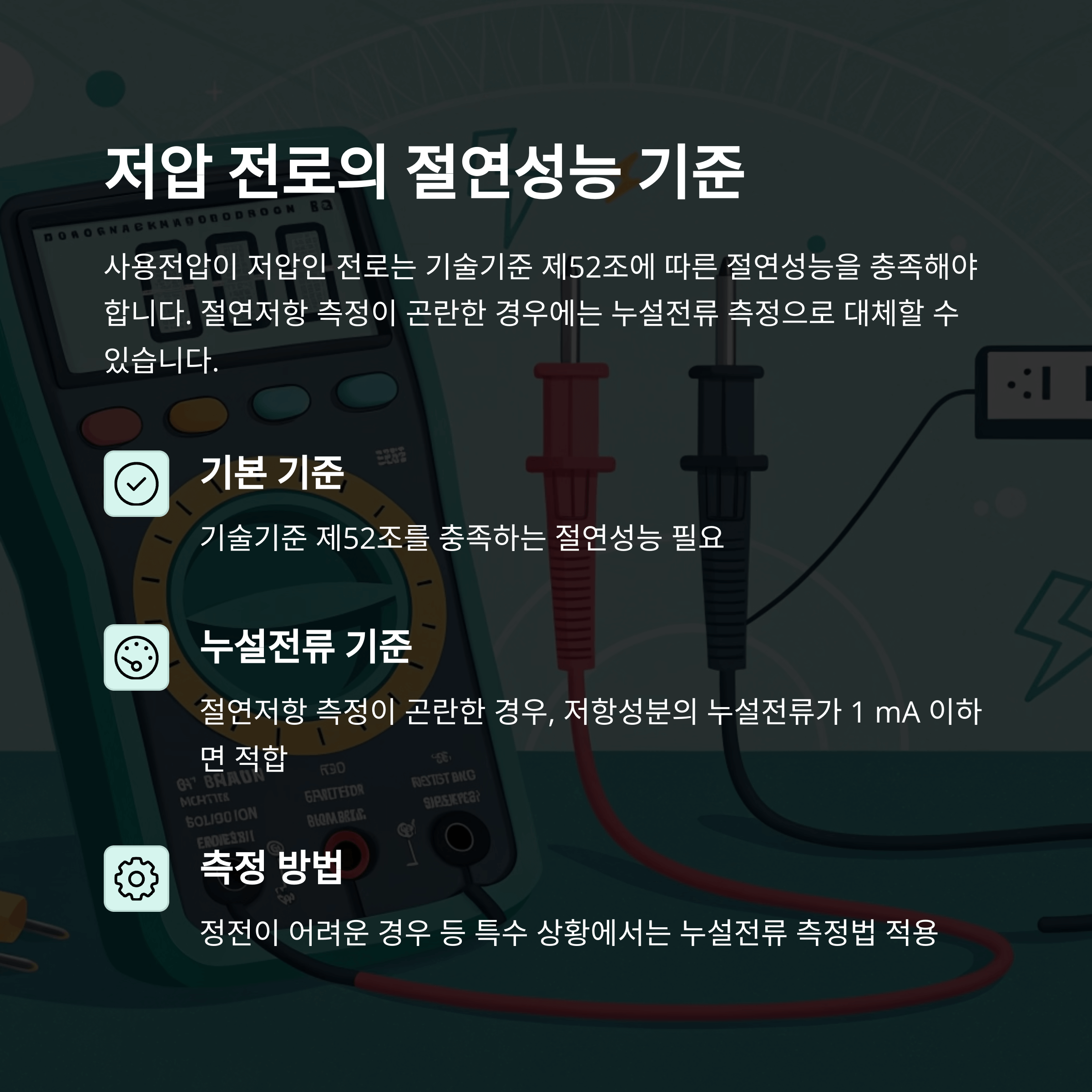 1. 사용전압이 저압인 전로의 절연성능은 기술기준 제52조를 충족하여야 한다. 다만, 저압 전로에서 정전이 어려운 경우 등 절연저항 측정이 곤란한 경우 저항성분의 누설전류가 1 mA 이하이면 그 전로의 절연성능은 적합한 것으로 본다.