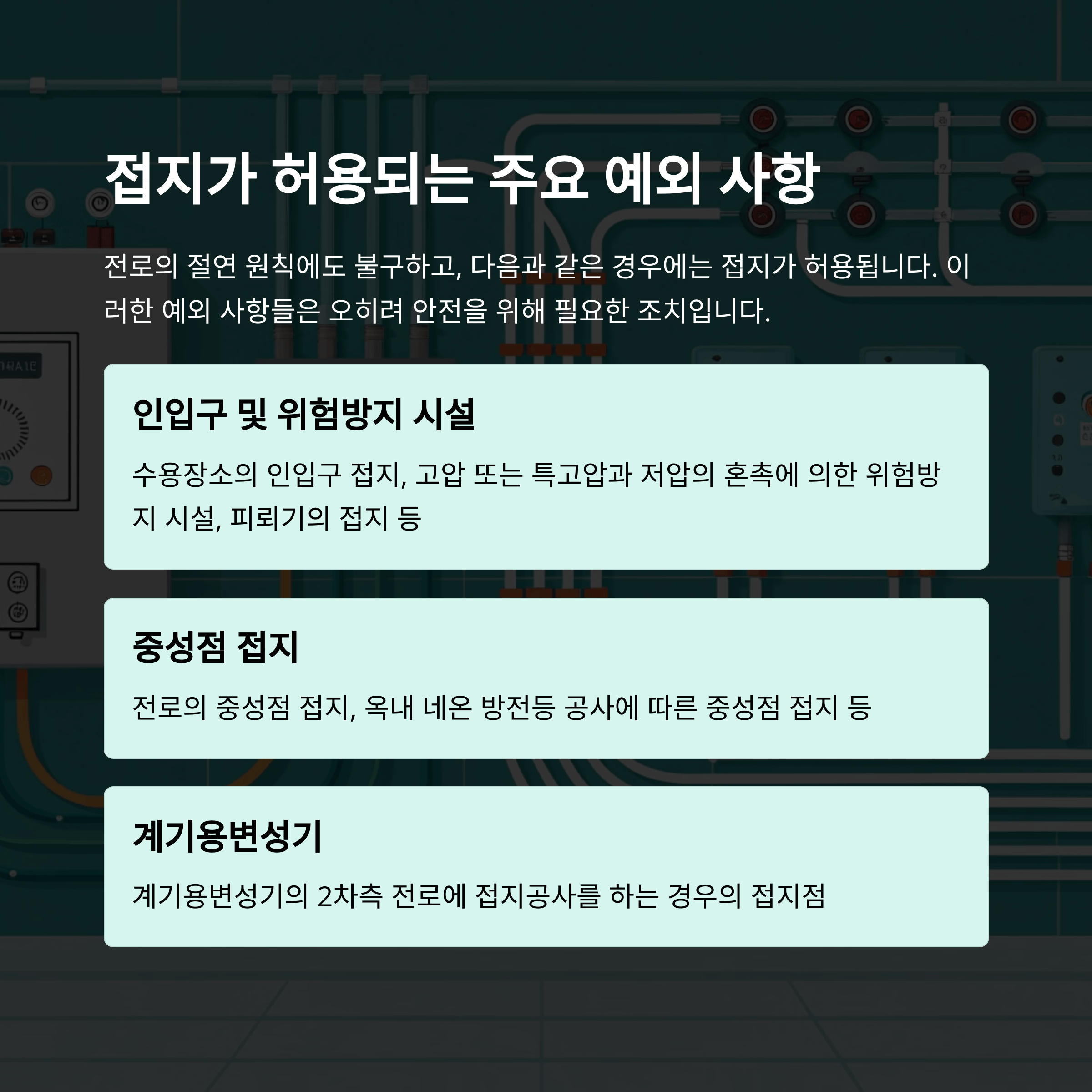 1. 수용장소의 인입구의 접지, 고압 또는 특고압과 저압의 혼촉에 의한 위험방지 시설, 피뢰기의 접지, 특고압 가공전선로의 지지물에 시설하는 저압 기계기구 등의 시설, 옥내에 시설하는 저압 접촉전선 공사 또는 아크 용접장치의 시설에 따라 저압전로에 접지공사를 하는 경우의 접지점