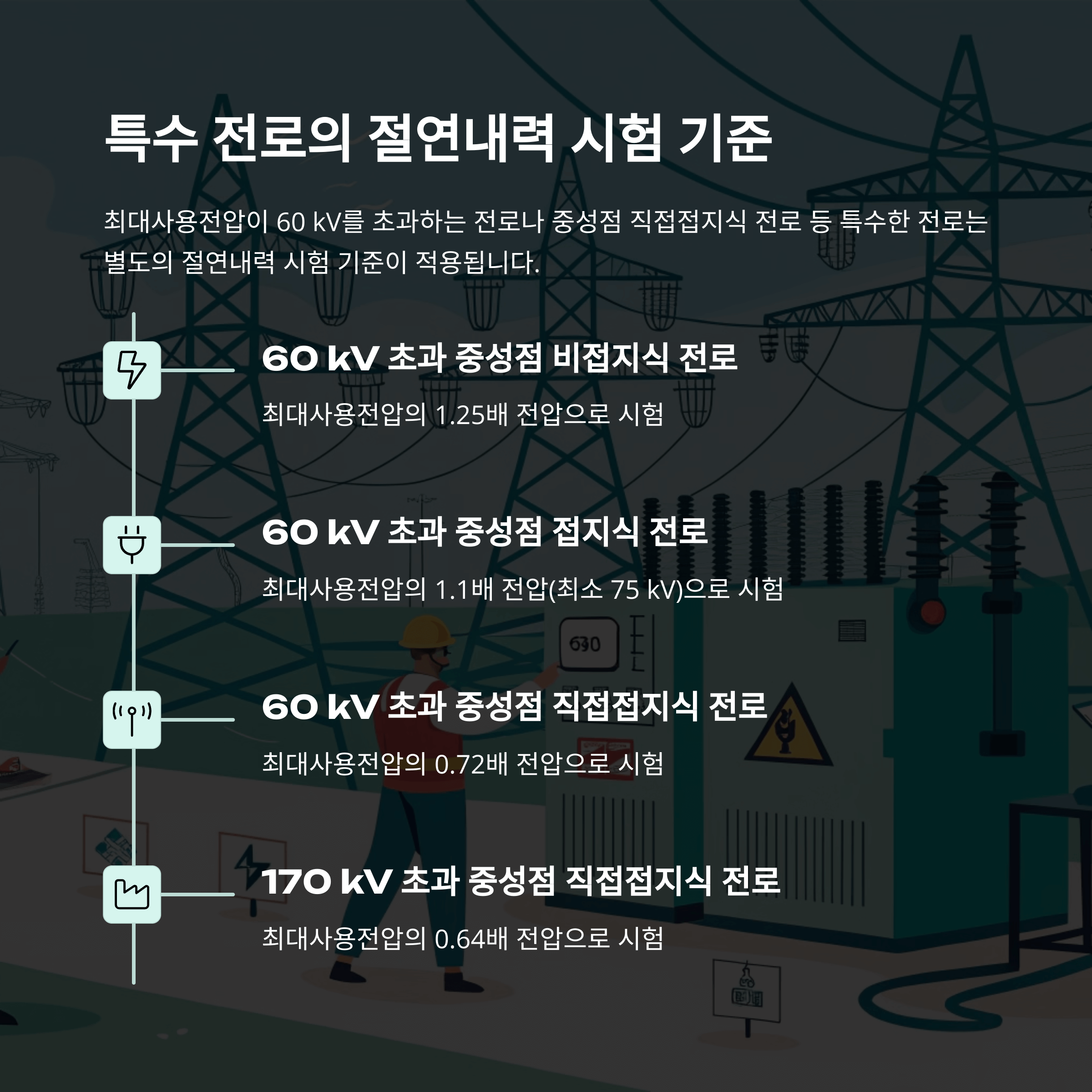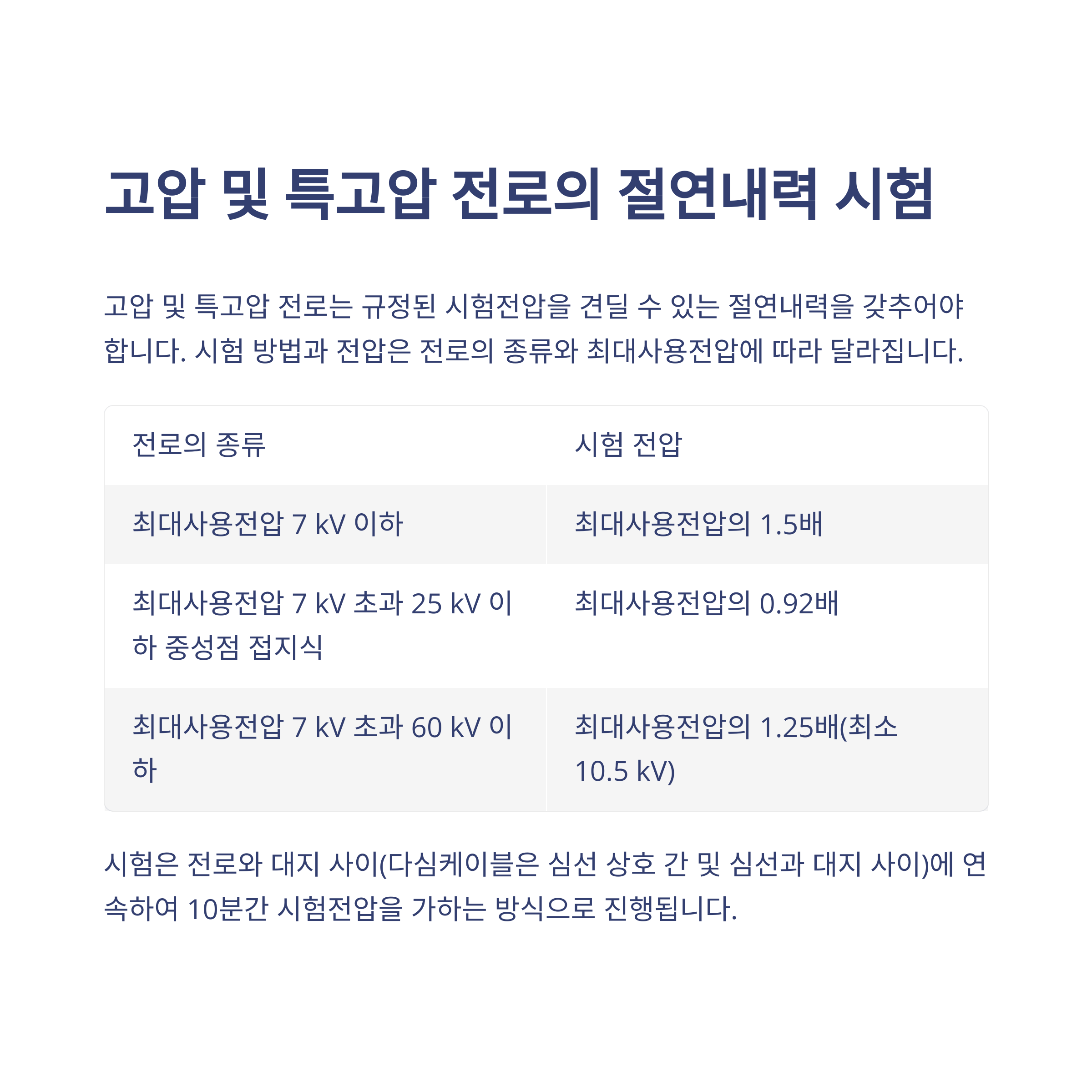 | 3. 최대사용전압 7 kV 초과 60 kV 이하인 전로(2란의 것을 제외한다) | 최대사용전압의 1.25배의 전압(10.5 kV 미만으로 되는 경우는 10.5 kV) |
