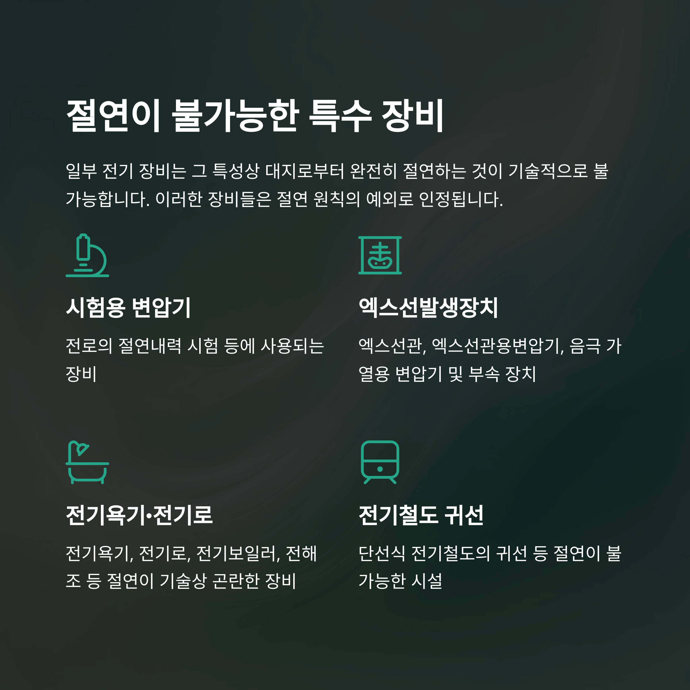 가. 시험용 변압기, 기구 등의 전로의 절연내력 단서에 규정하는 전력선 반송용 결합 리액터, 전기울타리의 시설에 규정하는 전기울타리용 전원장치, 엑스선발생장치(엑스선관, 엑스선관용변압기, 음극 가열용 변압기 및 이의 부속 장치와 엑스선관 회로의 배선을 말한다. 이하 같다), 전기부식방지 시설에 규정하는 전기부식방지용 양극, 단선식 전기철도의 귀선(가공 단선식 또는 제3레일식 전기 철도의 레일 및 그 레일에 접속하는 전선을 말한다. 이하 같다) 등 전로의 일부를 대지로부터 절연하지 아니하고 전기를 사용하는 것이 부득이한 것.