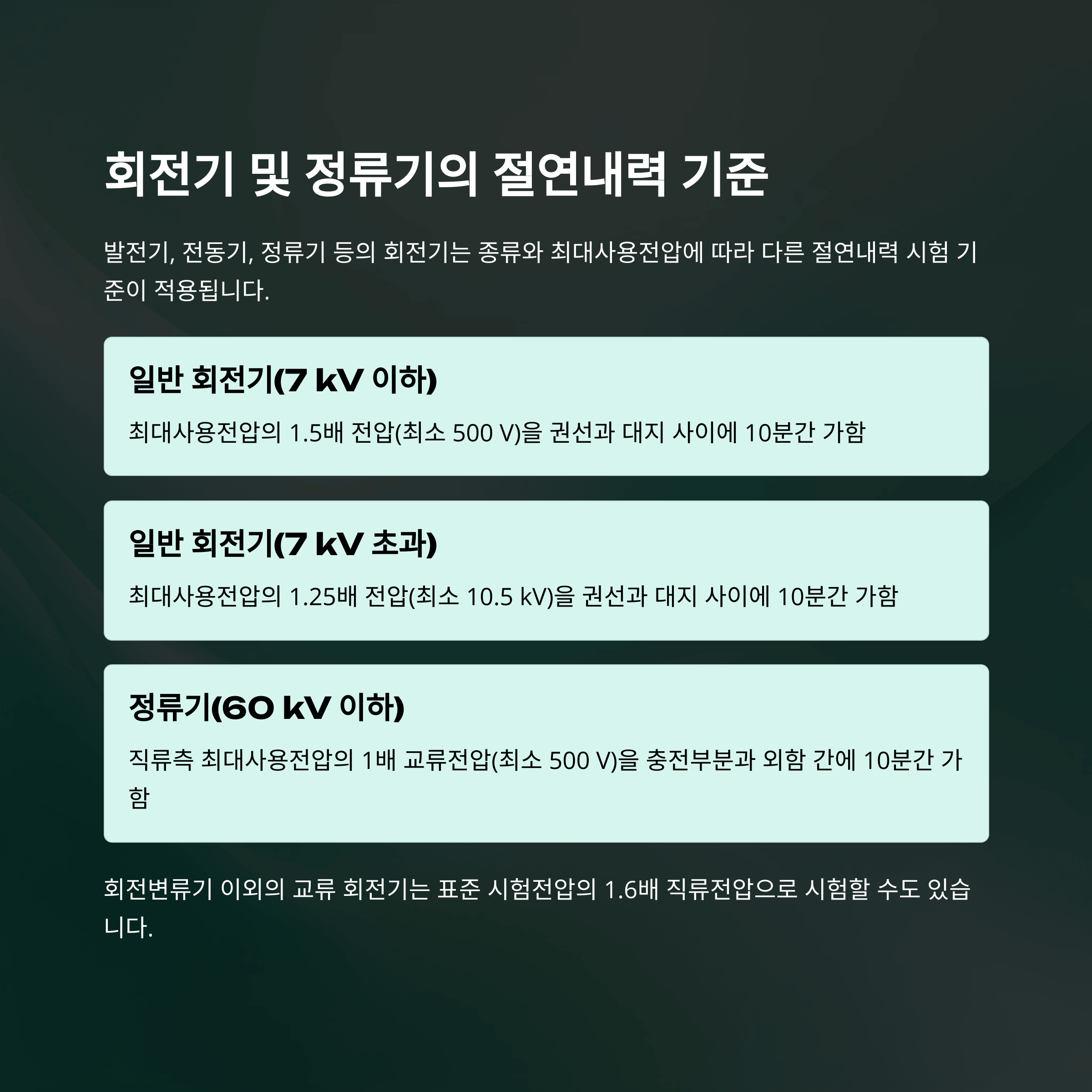 회전기 및 정류기는 표 133-1에서 정한 시험방법으로 절연내력을 시험하였을 때에 이에 견디어야 한다. 다만, 회전변류기 이외의 교류의 회전기로 표 133-1에서 정한 시험전압의 1.6배의 직류전압으로 절연내력을 시험하였을 때 이에 견디는 것을 시설하는 경우에는 그러하지 아니하다.
