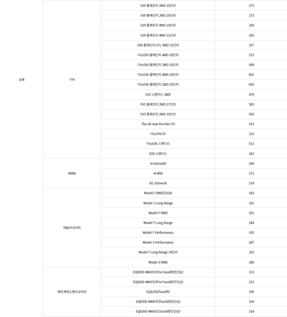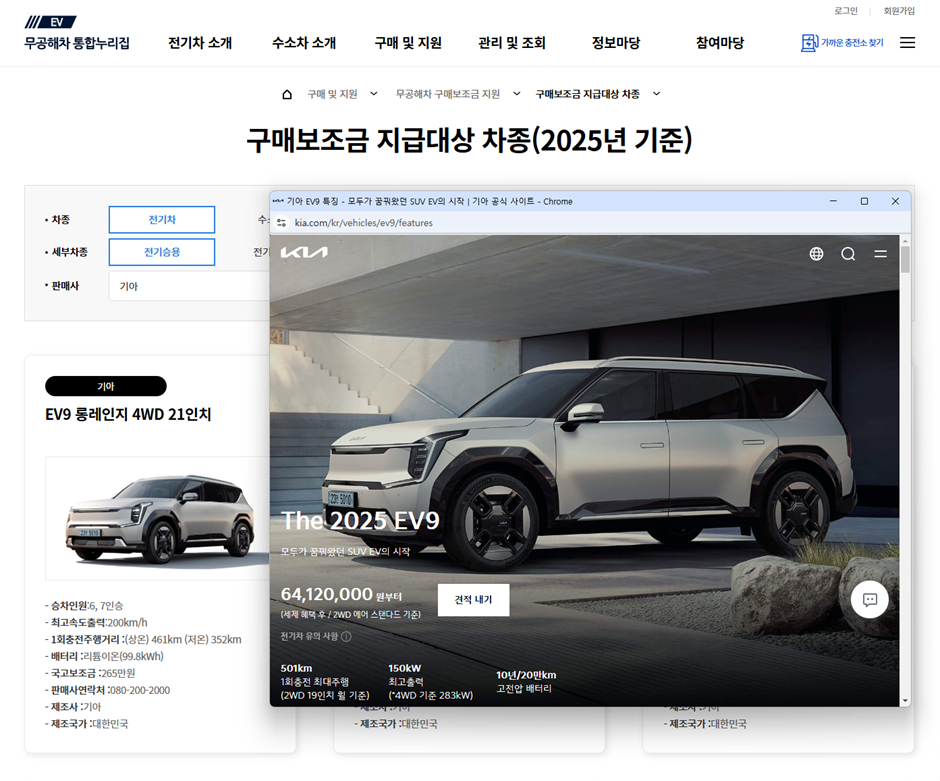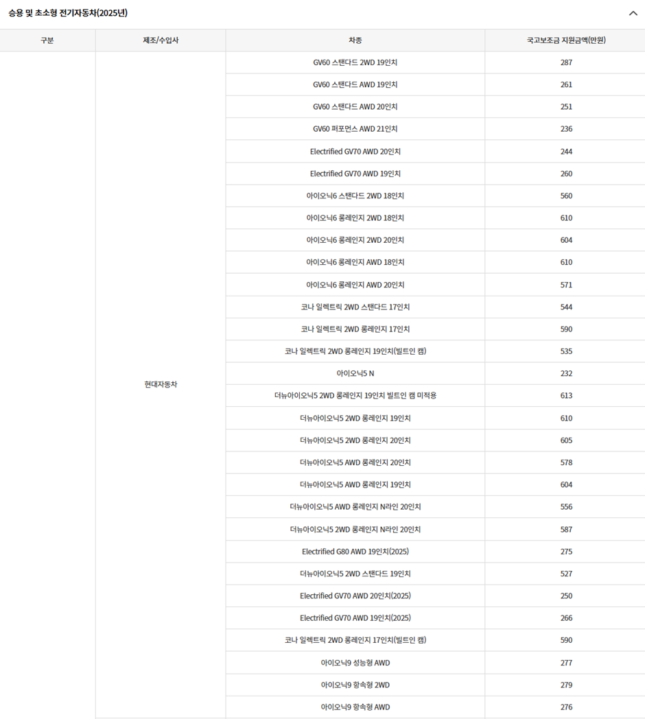 2) 2025년 승용 전기자동차 및 국고보조금 지원금액 리스트
