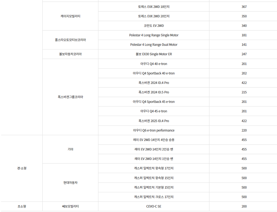 1) 2025년 승용 및 초소형 전기자동차 지원 차종 사양 및 금액