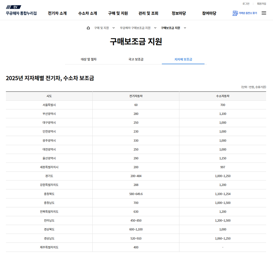 3) 2025년 지자체별 전기차, 수소차 보조금 지원